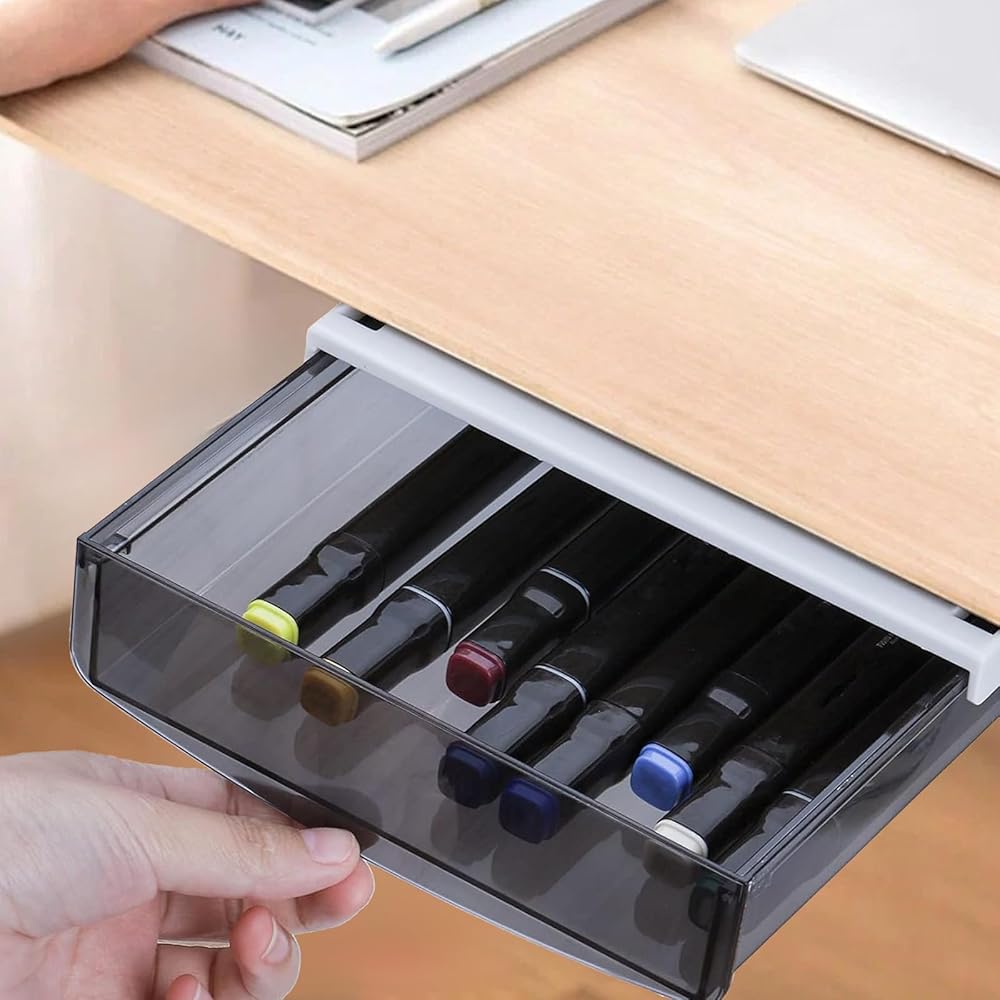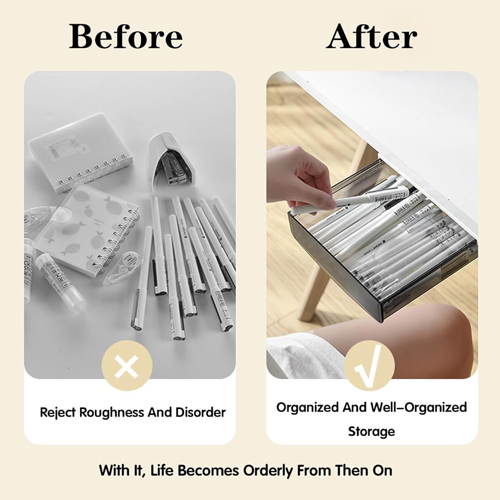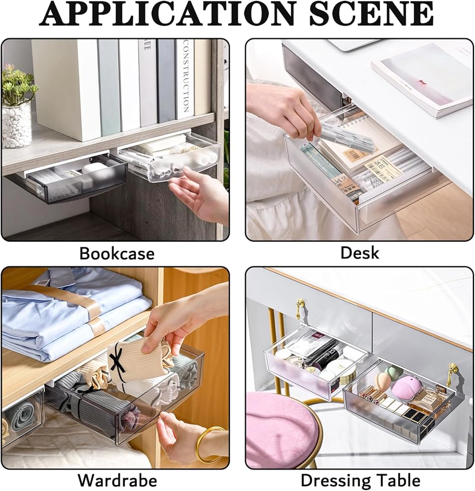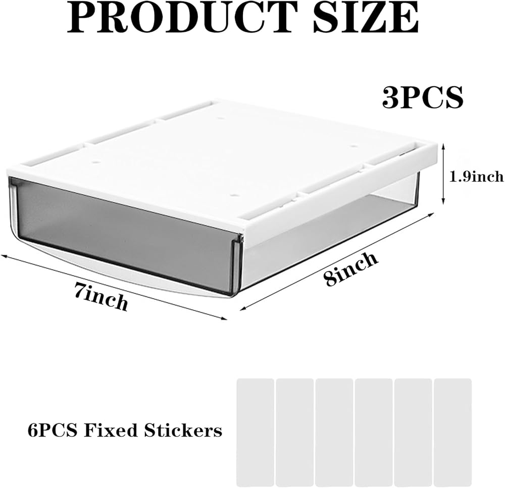 CAPACITY DESIGN: The box package contains 3 under desk organizer drawers and 6 strong non-marking stickers, the external size is 8.6x 7x2.1 inches. Can store a variety of items and keep your small items organized