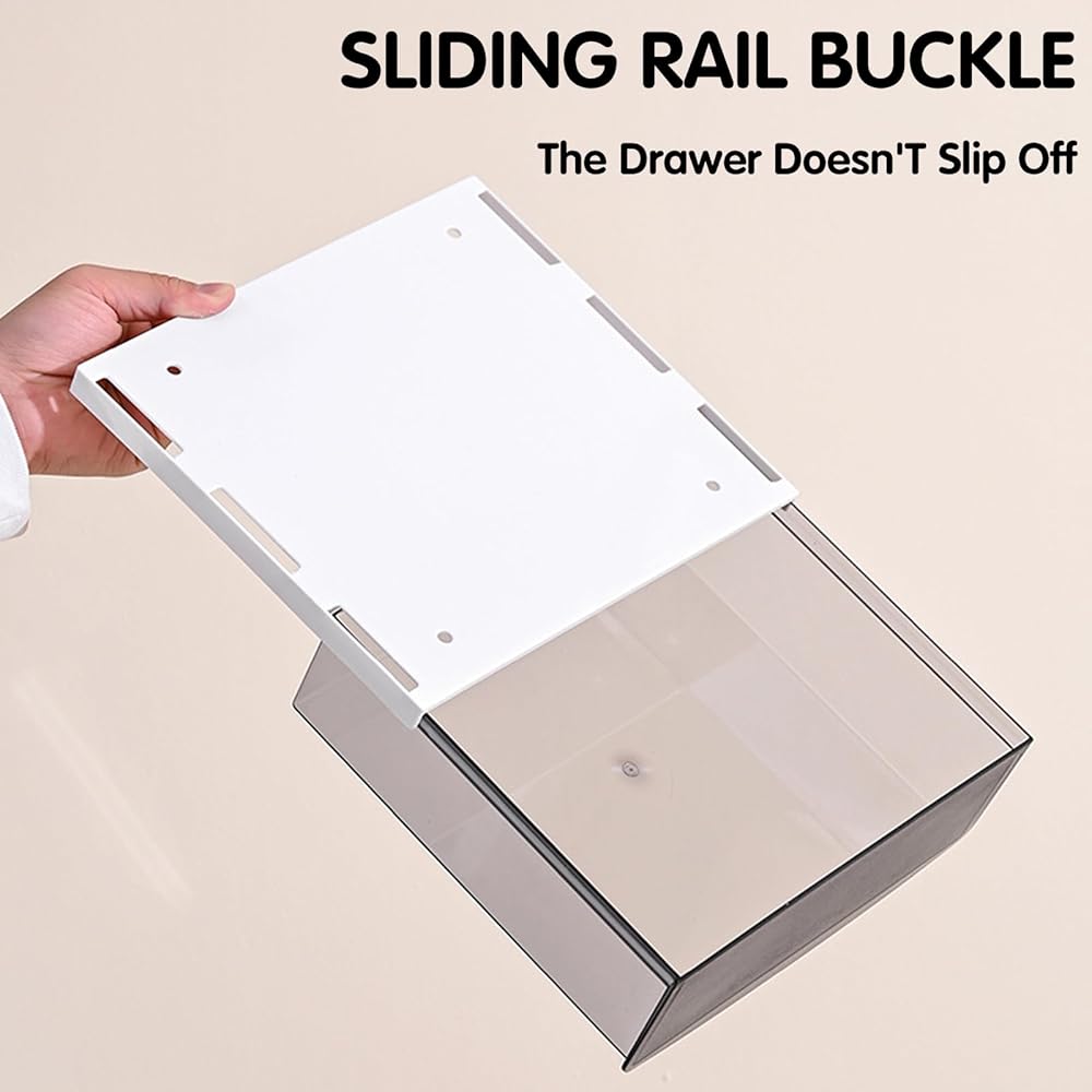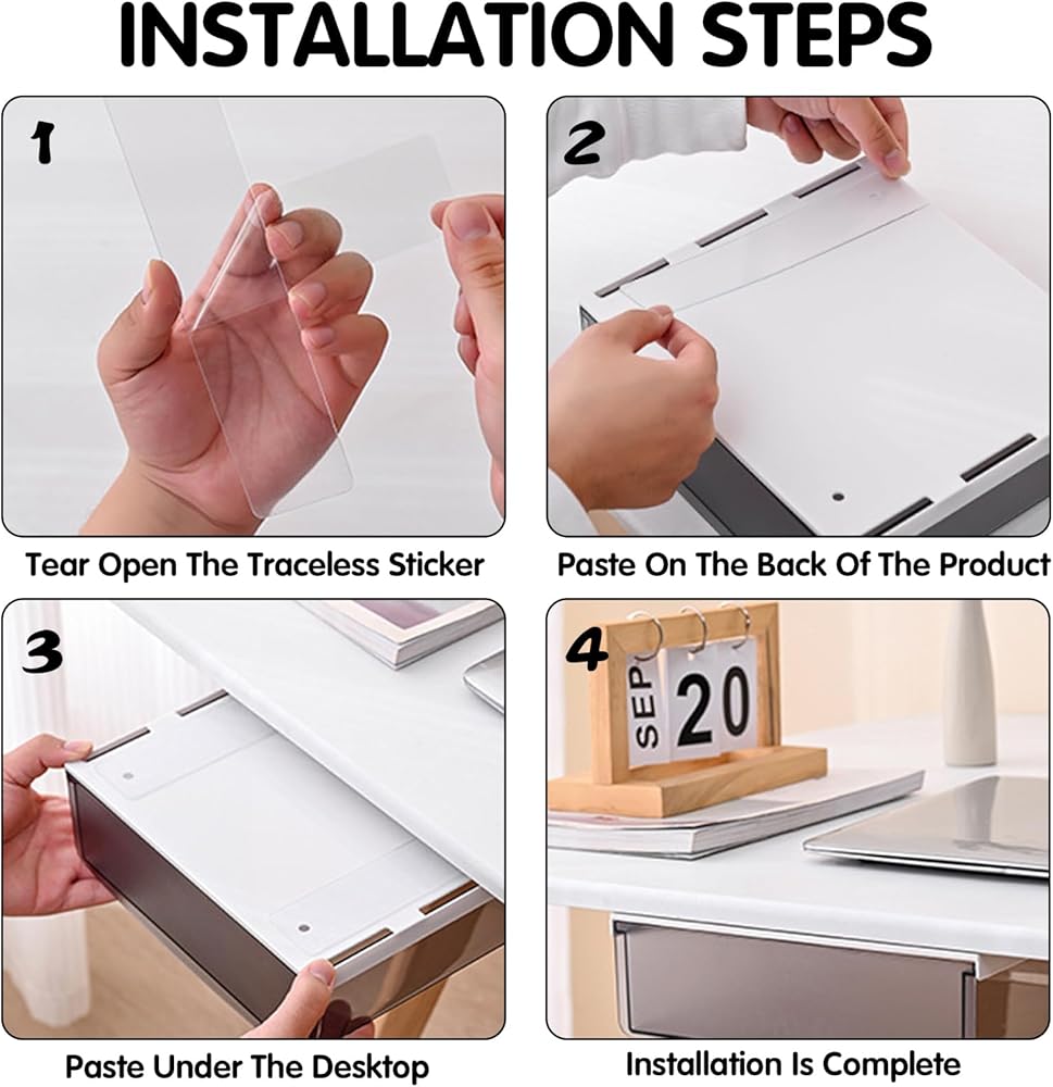 EXTREMELY EASY TO INSTALL: Before sticking, please wipe clean the place where you need to stick, then stick the non-marking sticker on the drawer box, then stick the back of the tape on the bottom of the smooth desktop and press it for about 30 seconds