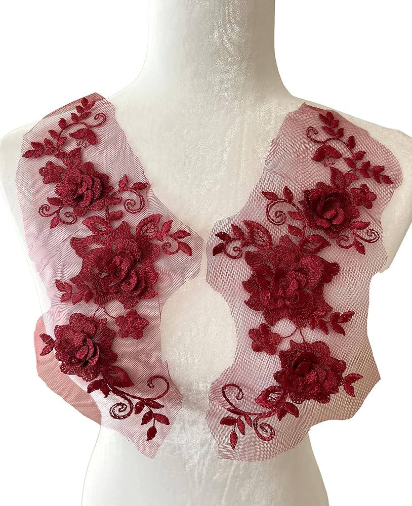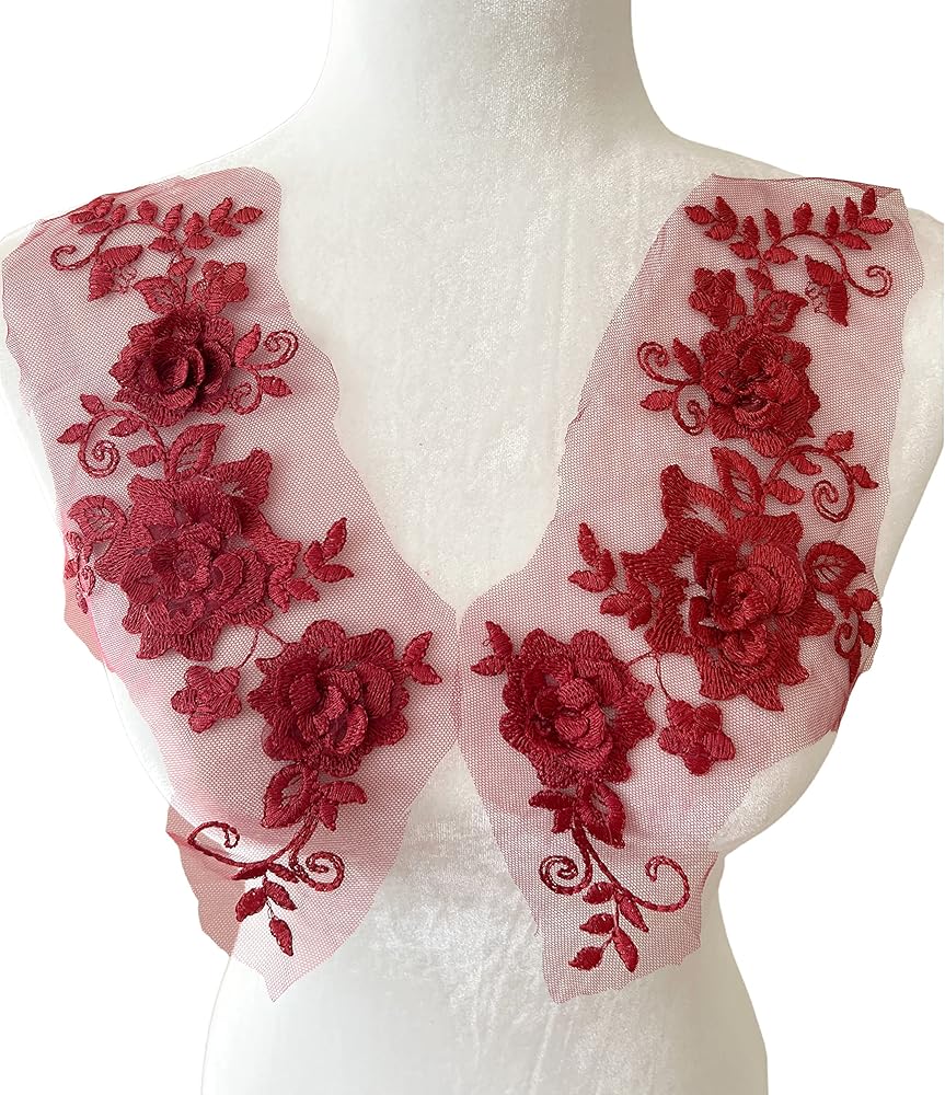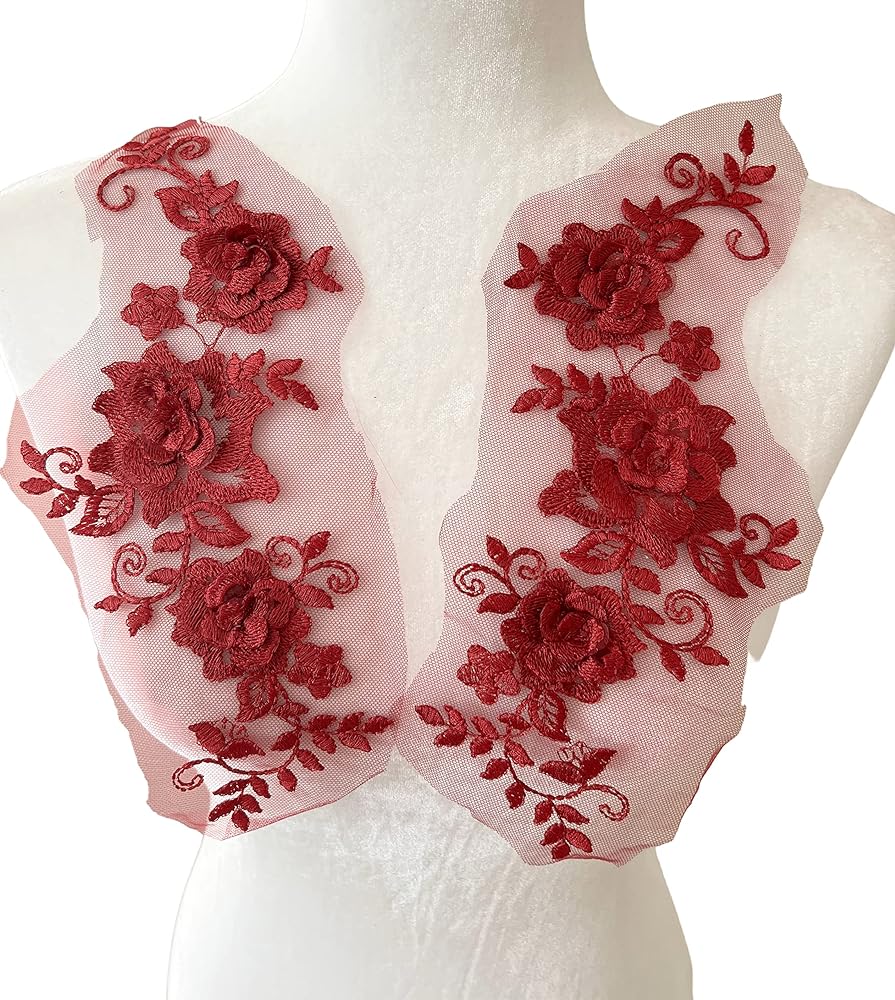 PEPPERLONELY 1 Pair Lace Big 3D Flower Wedding Dress Patch Embroidered Sew On Applique Lace Trim, 28 x 13cm, Burgundy