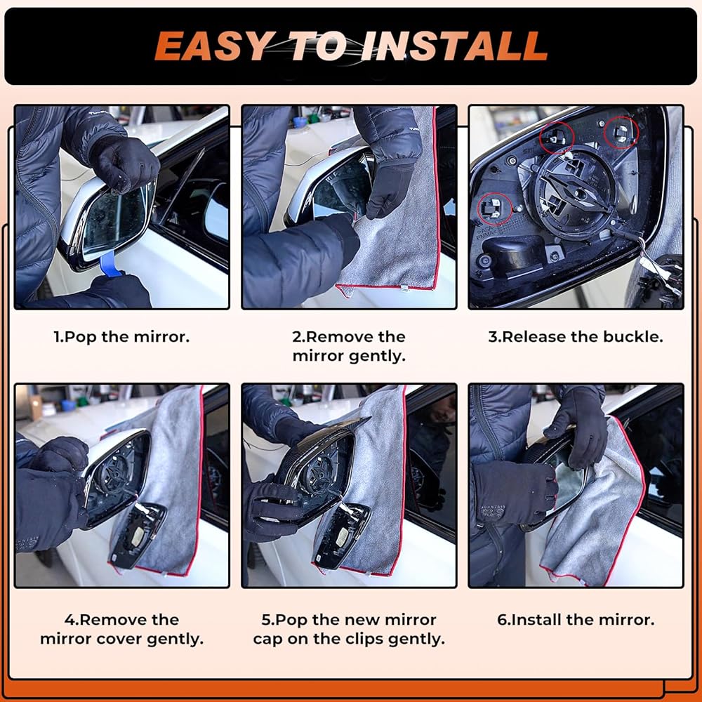 【Easy Installation】 The mirror cover is easy to install , just take few minutes allow you remove the old mirror caps and replace with these new ones. The installation process doesn't require you to disassemble or damage any original car parts