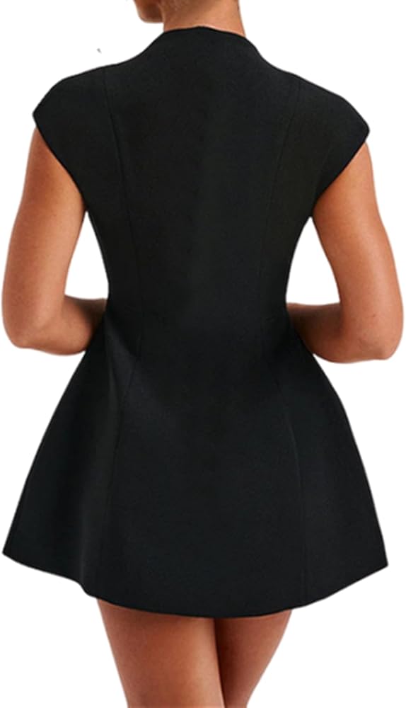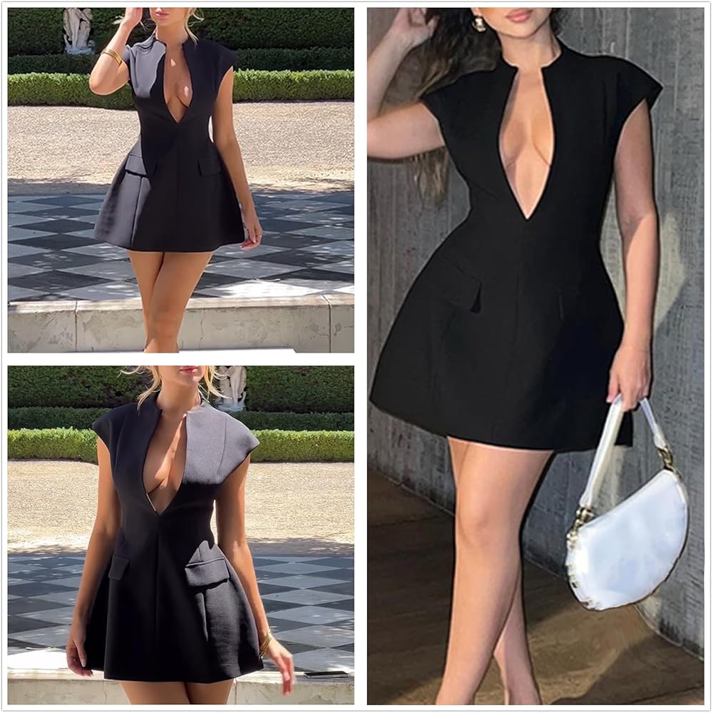 -Deep V neck, mini short style, double layer fabric, cap sleeve, A-line dress.