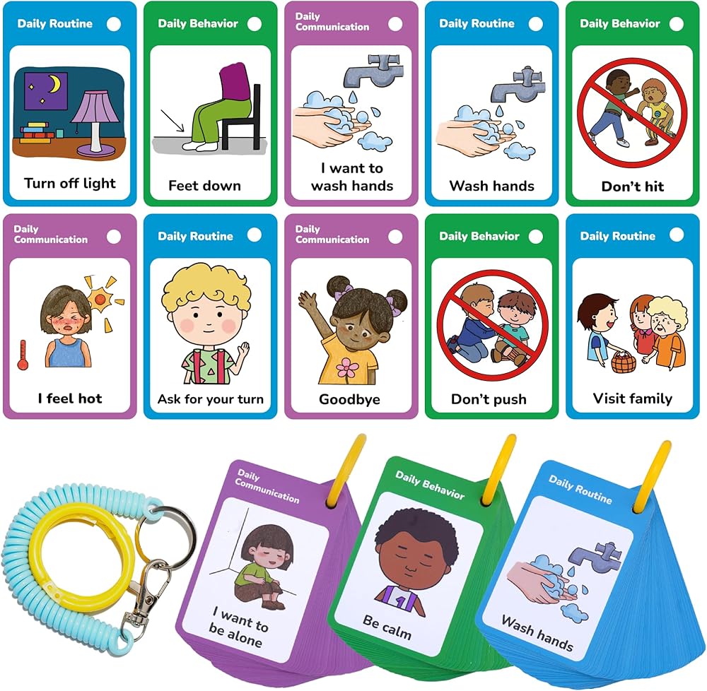 High-Quality Material: The autism communication cards are made from premium paperboard, featuring vibrant patterns printed on both sides with a protective surface coating that offers water resistance. The patterns are clearly printed, the colors are bright, and the metal components are durable and wear-resistant. These cards are designed for repeated use