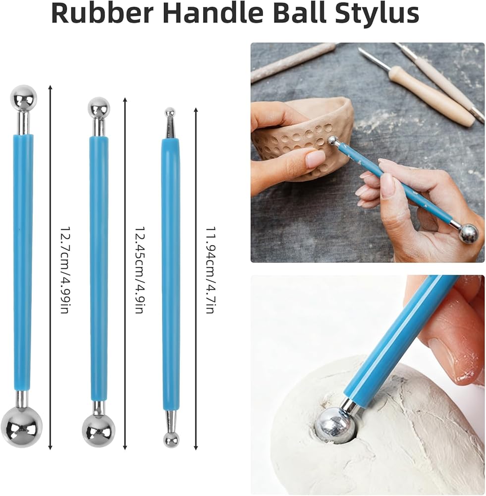 【Package Includes】This set of clay tools contains most of the basic tools you may need for pottery making and sculpting. Including 5*wooden carving/shaping tools, 5*double-headed rubber nibs and dotting pens, 4*rubber handle ball stylus, 8*double-ending tools in different shapes, 4*plastic stylus, 3*scrapers,1*pottery sponge,1*black storage bag.