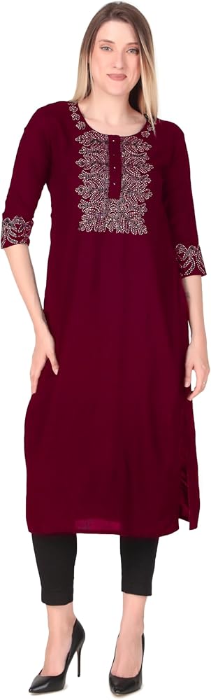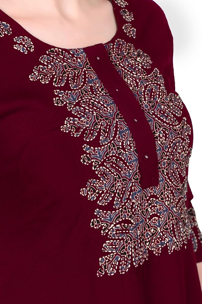 1-Piece Tunic: This set includes a single tunic, No bottoms...LENGTH: Top - 45 inches; Sleeves - 3/4 length..TUNIC: Crafted from premium liza rayon fabric plain in round neck pattern...Beautiful ethnic printed patch along with katha stitch handwork on front and sleeves border...|Size Chart Guide|: Find the perfect fit with our size options, based on the ready garment measurements of the chest. For more sizing details, please refer to the last product image featuring the Size Chart...