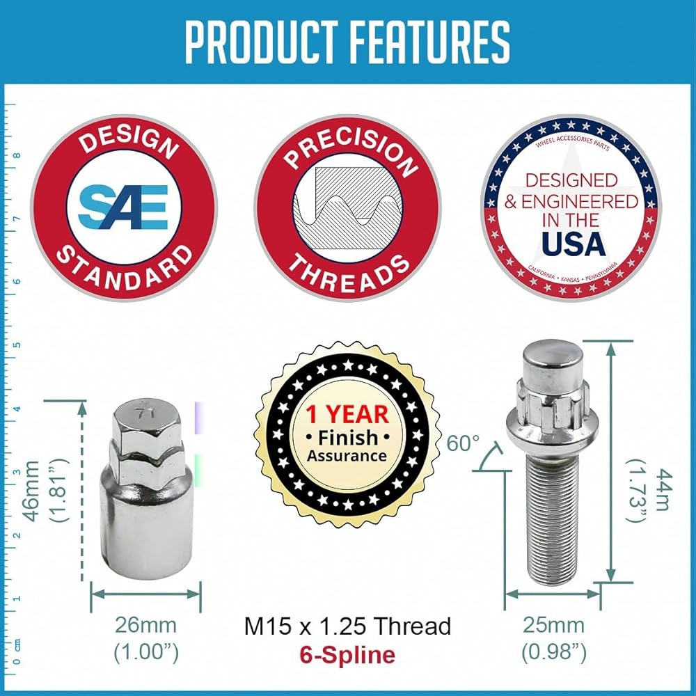 Designed In USA. Our chrome and black lug bolts are a perfect accent to your Aftermarket Wheels. Each bolt meets or exceeds factory specifications, SAE Grade 10.9