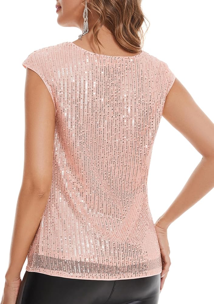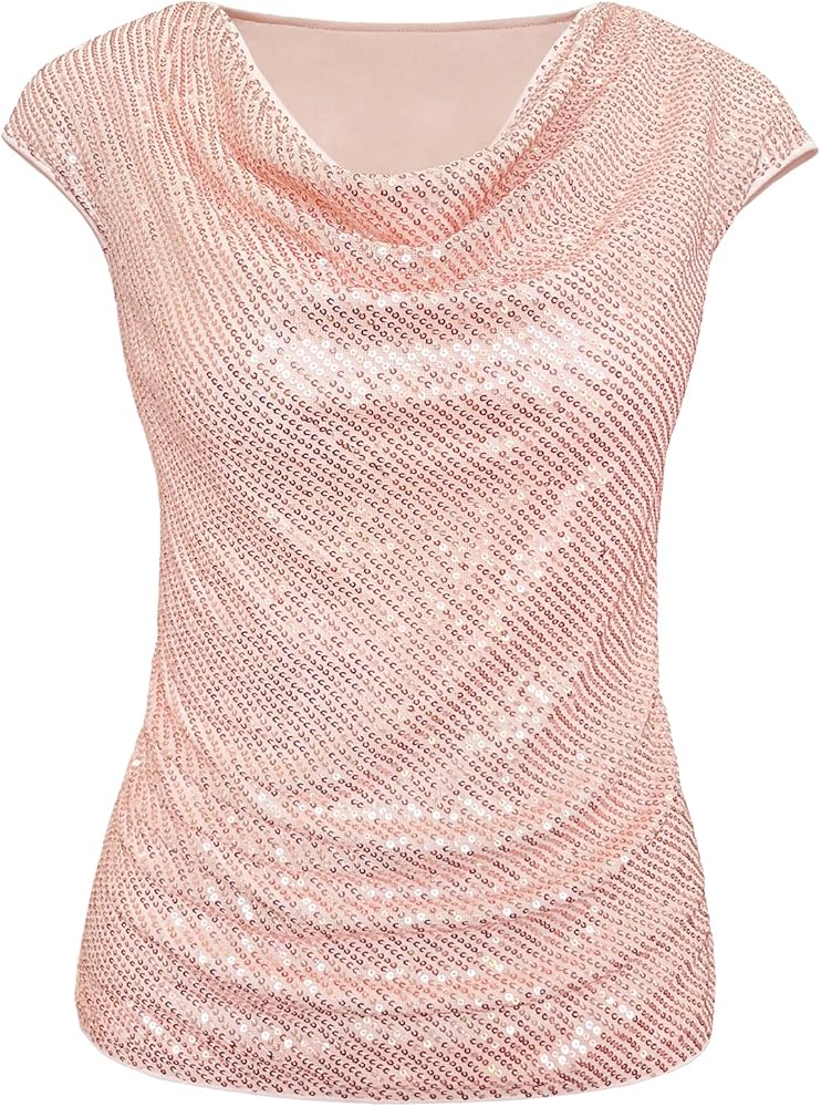 Features: This Sparkly Top with Cap Sleeves and a Cowl Neck design, highlighting the elegant lines of the collarbone. The Party Tops is Loose Fit and has elastic sequin fabric pair beautifully with heels, earrings, and a delicate necklace, guaranteeing you will be the center of attention at any party