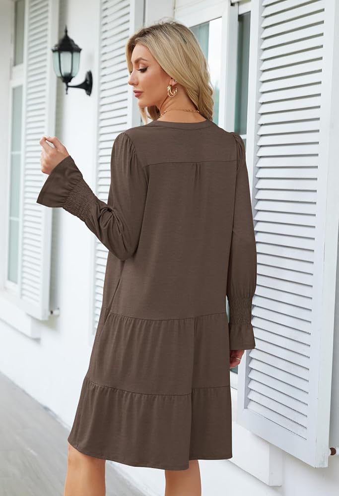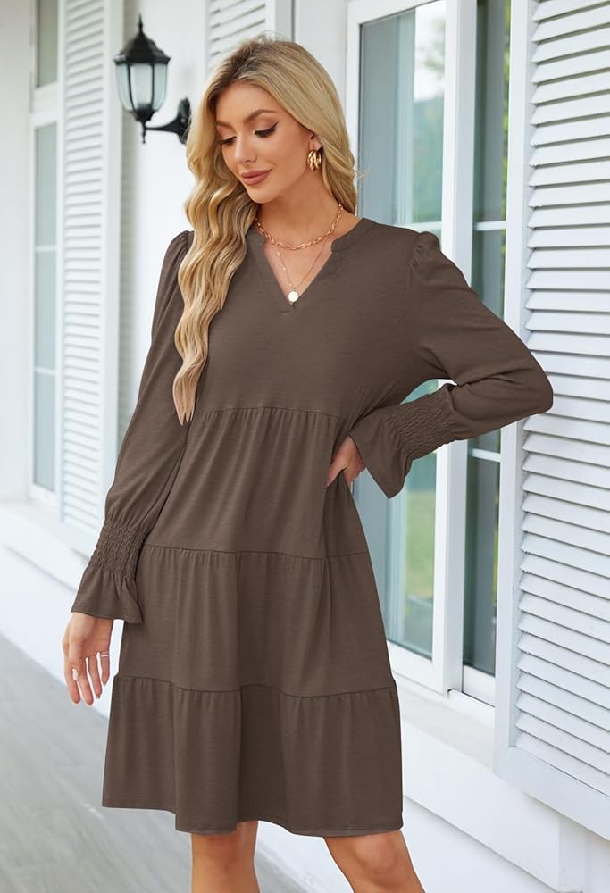 Features: V neck, long puff sleeve, elasticated ruffle cuff, loose empire waist, flowy swing shape, tiered hem, a-line, solid color, with 2 pockets, dresses for women 2024 casual, midi dress.