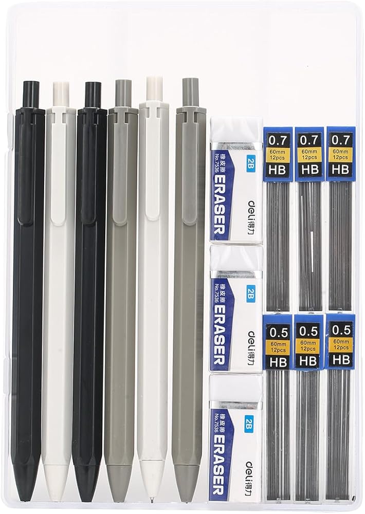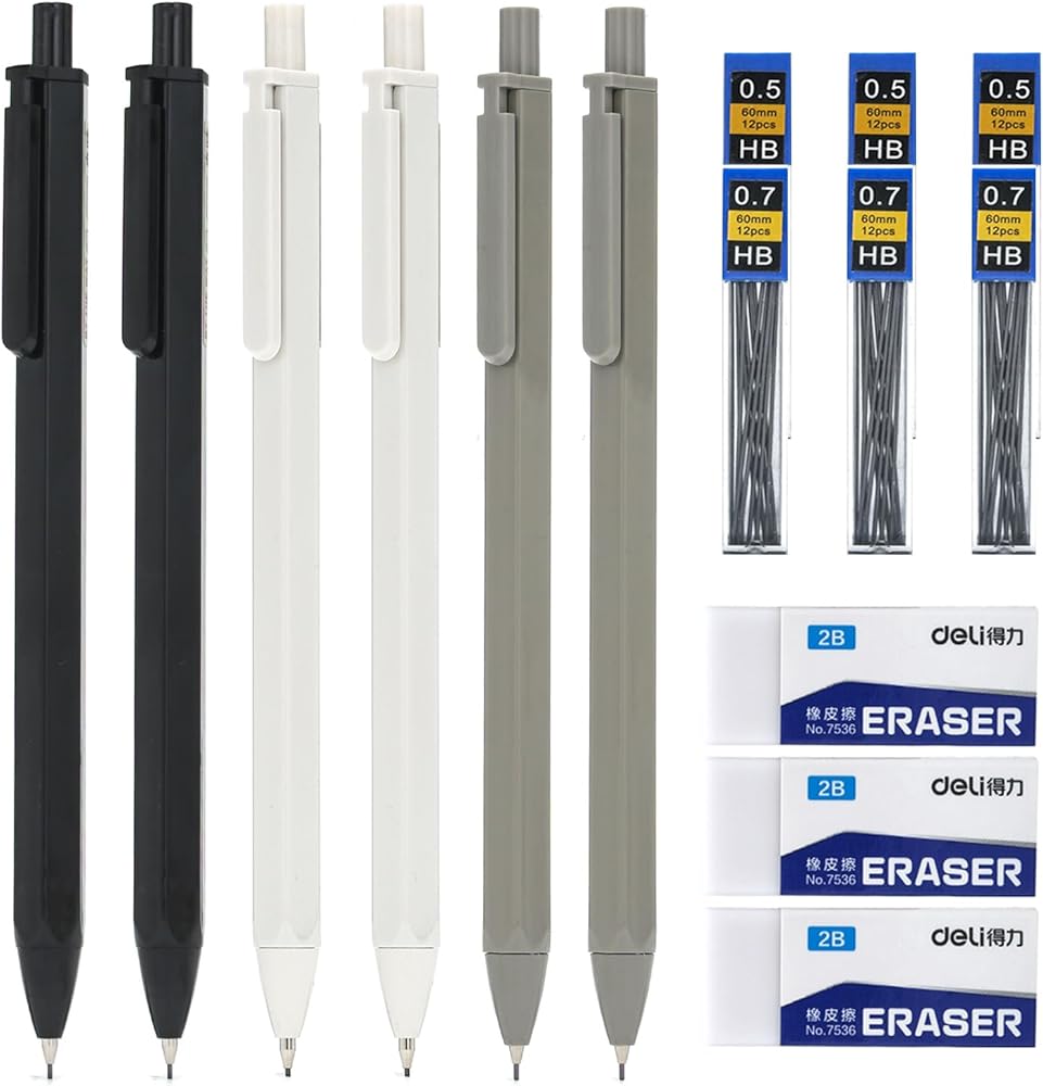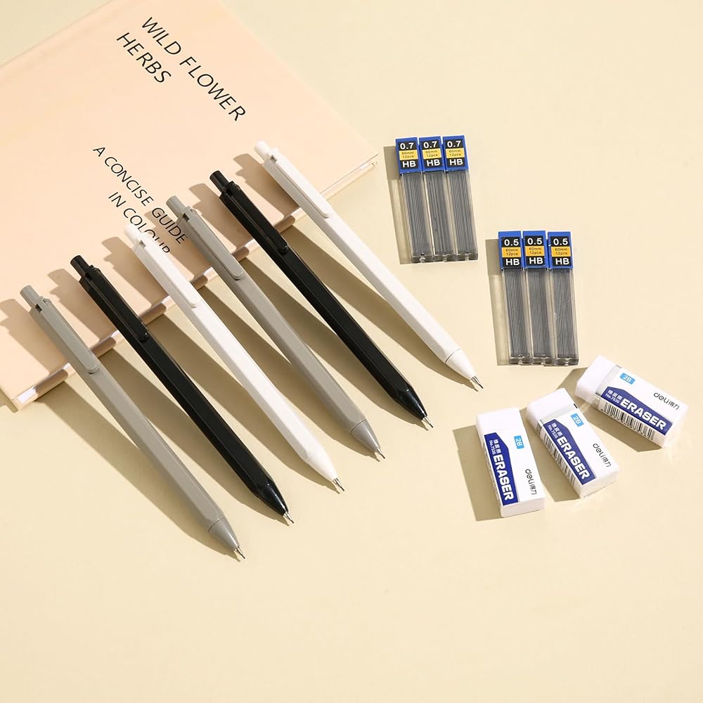 [Package Includes]: You will receive a box of 6pcs aesthetic mechanical pencils, 6 tube 0.5 & 0.7mm lead refills, 3pcs erasers