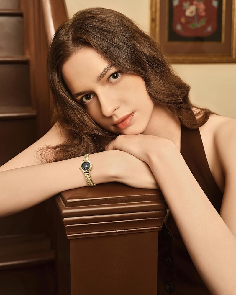 【 Compact & Precision Fit 】: Dainty gold watch Stylish Fusion designed with a petite case size (Case diameter: 22mm; Band width: 8mm; Max band length: 180mm 👉ADJUSTABLE👈). Perfect for women who prefer a smaller, more delicate look on their wrists. The small size womens watch ensures that the watch sits comfortably without overpowering the wrist.