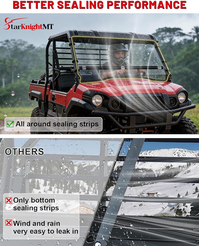 【NOISE REDUCTION】The Mule PRO FX windshield is with rubber sealing design, which helps to not only be cushioning and shockproof but also increases sealing and reduces rattle,in additional, the wind noise will be decreased greatly after the mule pro front windshield is installed