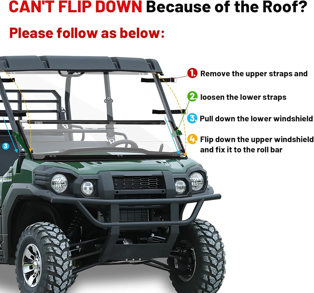 【FITMENT】This Mule PRO Flip windshield can be perfectly compatible with the following Kawasaki Mule Pro four models: (1) Mule Pro DX 2016-2024, (2) Mule Pro DXT 2016-2024, (3) Mule Pro FX 2016-2024, (4) Mule Pro FXT 2015-2024. This windshield can be used with most soft or hard tops. But please note this windshield does NOT FIT 2018+ MULE FXR. Please check if it will fit your Mule Pro before ordering it