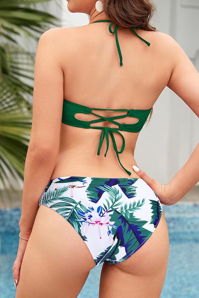 SHEKINI Women's Bandeau Bathing Suit Halter Lace Up Bikini V Cut Two Piece Swimsuits