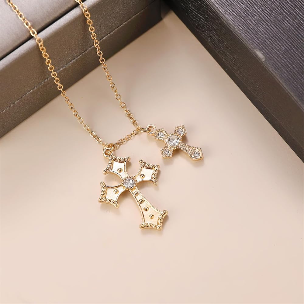 Dreuyet Cross Necklace for Women Trendy Rhinestone Double Cross Pendant Necklace Charm Baroque Style Cross Choker Necklace Valentines Day Christmas Day Jewelry Gifts