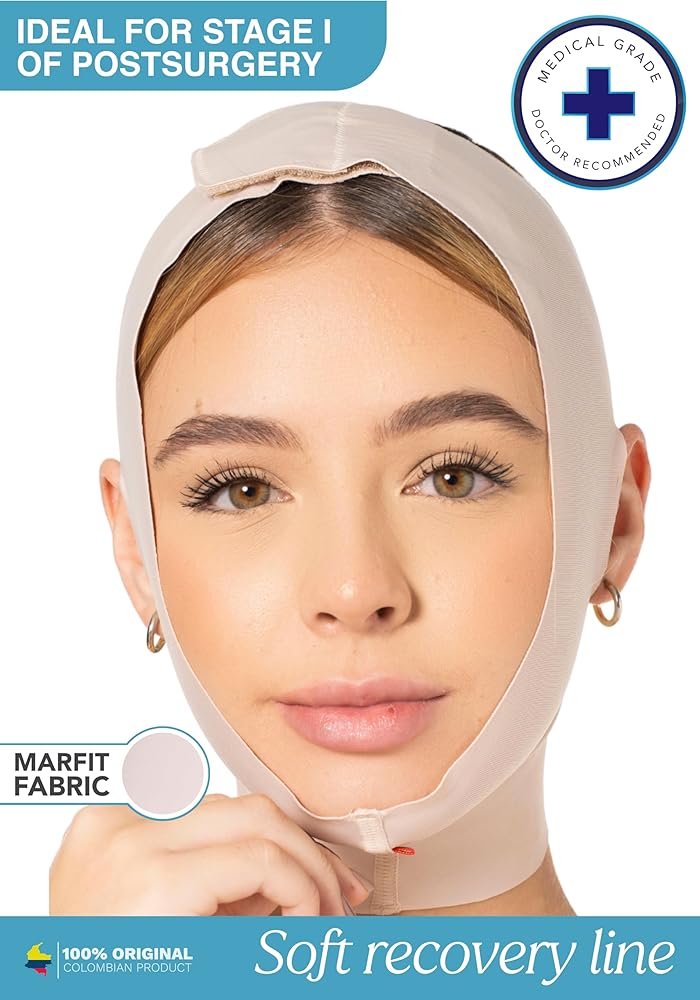 Post Surgery Chin Lift After Lipo Compression Garment Strap Mentonera Post Quirúrgica FacialWe just want what's best for you! That's why we have designed this double chin strap face slimming to help you go through your recovery safe and sound. Thanks to its amazing design, style, and materials, our chin mask lift works perfectly after surgeries such as bichectomy, double chin lipo, otoplasty, facelift, Chin Augmentation, or Jaw Surgery. This lipo wrap helps to reduce swelling, bruising, and discomfort after surgery. It also offers proper alignment and positioning of the chin and jaw area. We have selected the kind of fabric that will not only make you feel comfortable as you recover but also take care of your skin. Our chin compression garment after lipo is made of Marfit fabric, a medical-grade material known for its softness and medium compression. This post lipo compression garment offers breathability and it is easy to clean and maintain for long-lasting use. Our chin faja after lipo features an adjustable strap with hooks and loops for the best fit. Those grip points allow personalized compression and secure placement. Designed with holes for ear outlets that ensure comfort, durability, and safety. This chin sculpting mask enhances your results after surgical procedures providing optimal support and compression. It also provides a comfy and secure fit for extended periods of wear.MENTONERA POSTQUIRURGICA FACIAL PARA PAPADASNuestra mentonera para papada está hecha de Marfit, un material cómodo, suave y que permite que la piel respire. Esta mentonera faja para la cara cuello y papada ofrece compresión media y puedes ajustarla a tu medida gracias a su sistema de cierre de contacto. Tiene un diseño con aberturas para la salida de las orejas y es ideal para cirugías como Bichectomia, Lipo de papada, Otoplastía, Facelift, Chin Augmentation y Jaw Surgery.