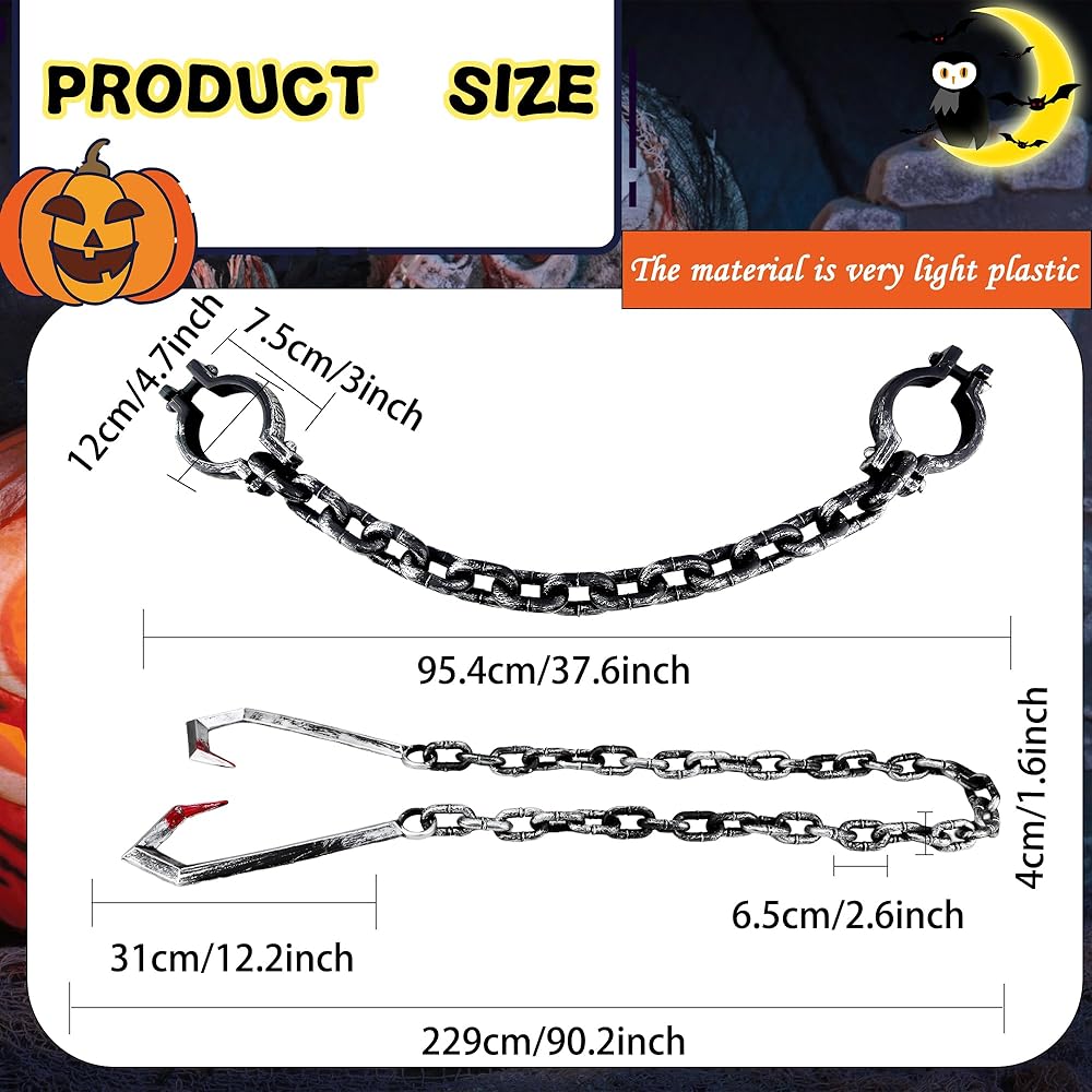 Size: Prisoner Wrist Shackles Chain Handcuffs Cosplay: 37.56 inches/ 95.4 cm Fake Butcher Hook Plastic: 90.15 inches/ 229 cm ( in length )