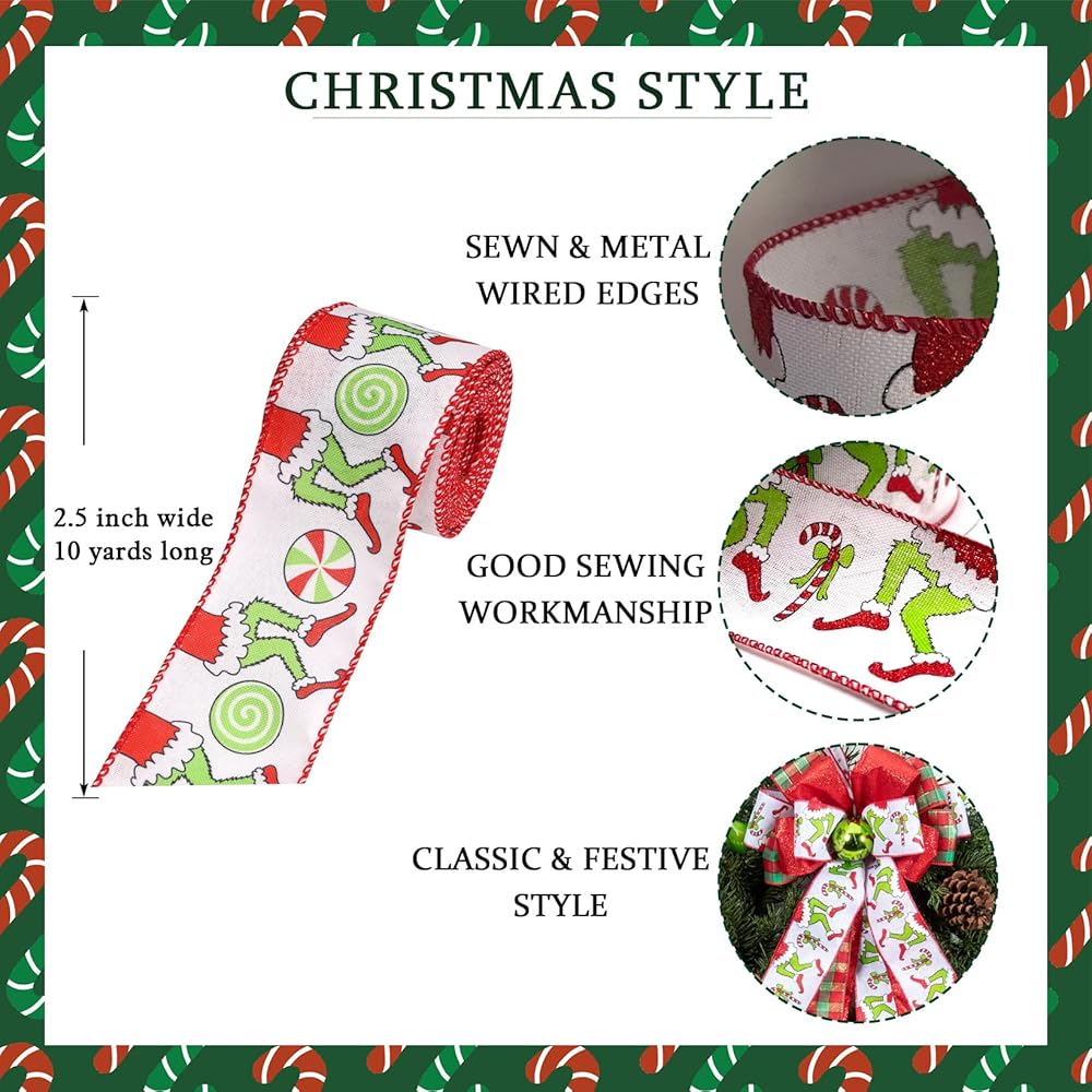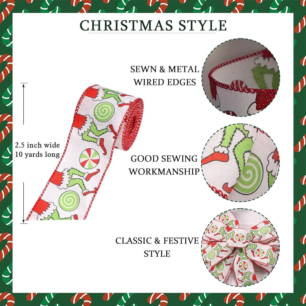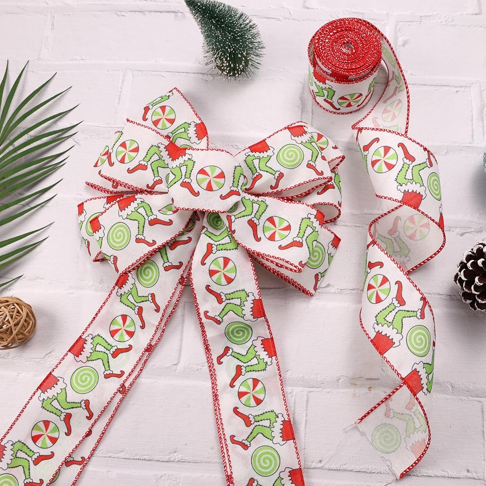 Christmas Ribbon for Tree, Red Green Funny Xmas Cartoon Character Ribbon Wired Peppermint Fabric Ribbons Gift Wrapping DIY Craft Wreath Bows Making Xmas Tree Decor Party Decoration, 10 Yards x 2.5inch