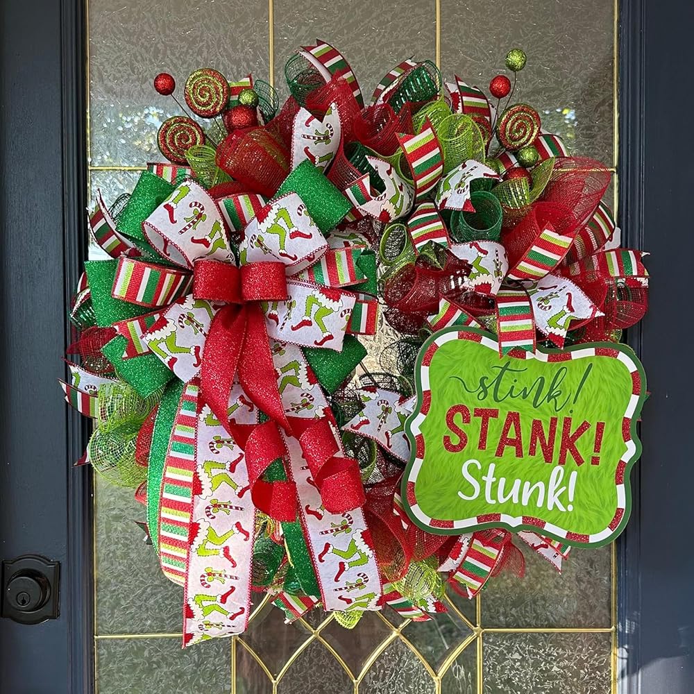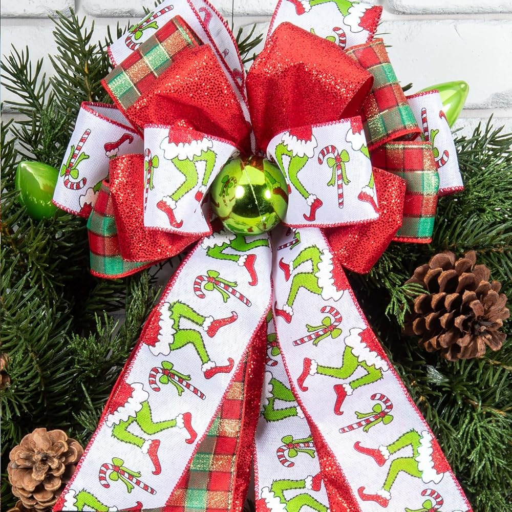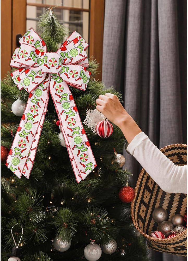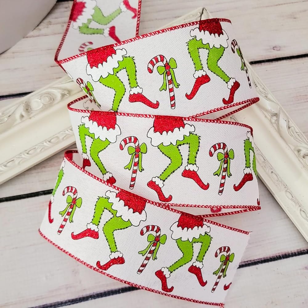 Christmas Ribbon for Tree, Red Green Funny Xmas Cartoon Character Ribbon Wired Peppermint Fabric Ribbons Gift Wrapping DIY Craft Wreath Bows Making Xmas Tree Decor Party Decoration, 10 Yards x 2.5inch