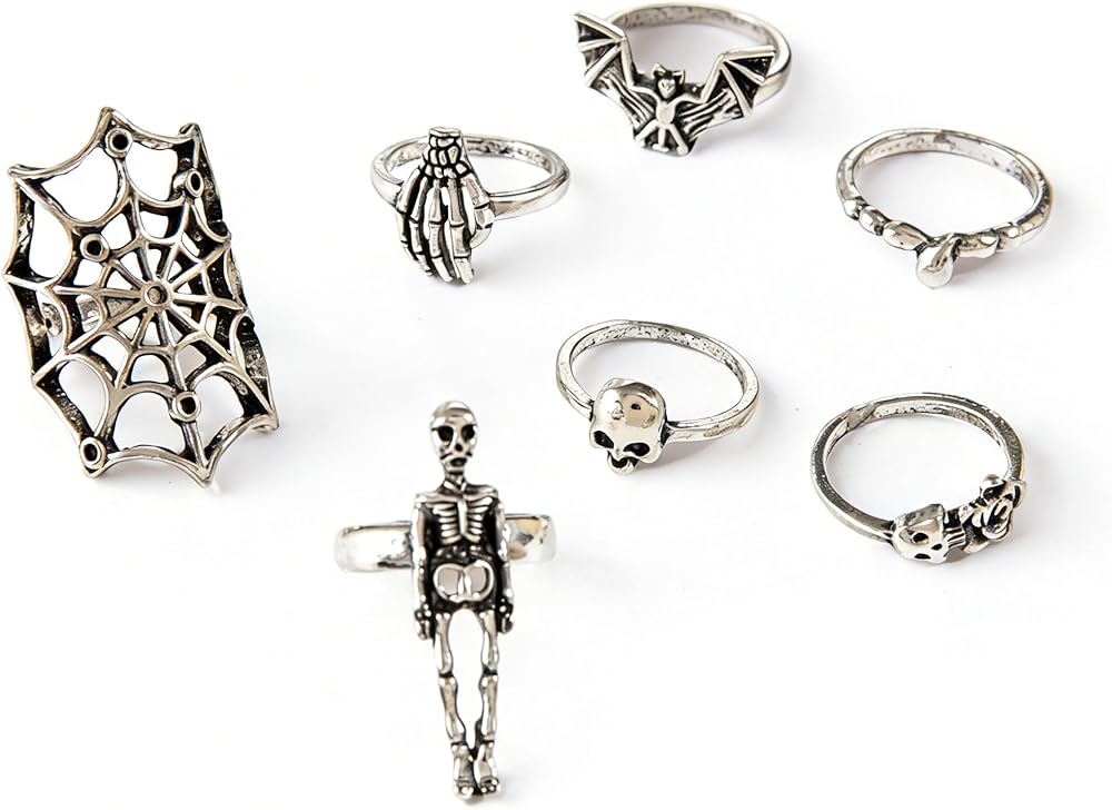 vintage halloween bat rings set: Designed for women who love to make a statement, our Gothic Silver Ring Set effortlessly complements any outfit, whether it's a casual day out or a halloween special occasion. Its versatility allows you to mix and match different rings to create your own personalized look.