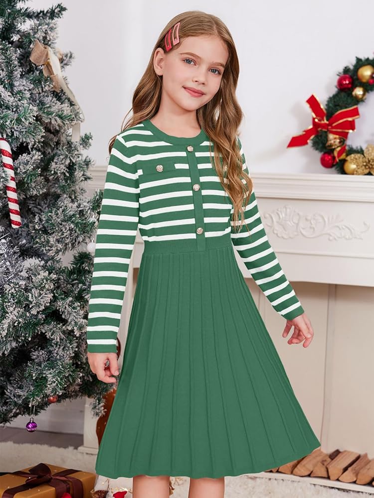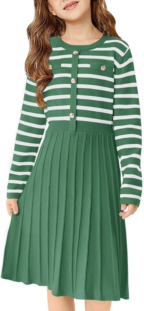 Elegant Girls Fall Dress: This girls long sleeve dress features a striped design, paired with exquisite retro buttons and chest pockets, making the entire dress look very elegant and refined. The versatile round neck midi dress is suitable for everyday wear