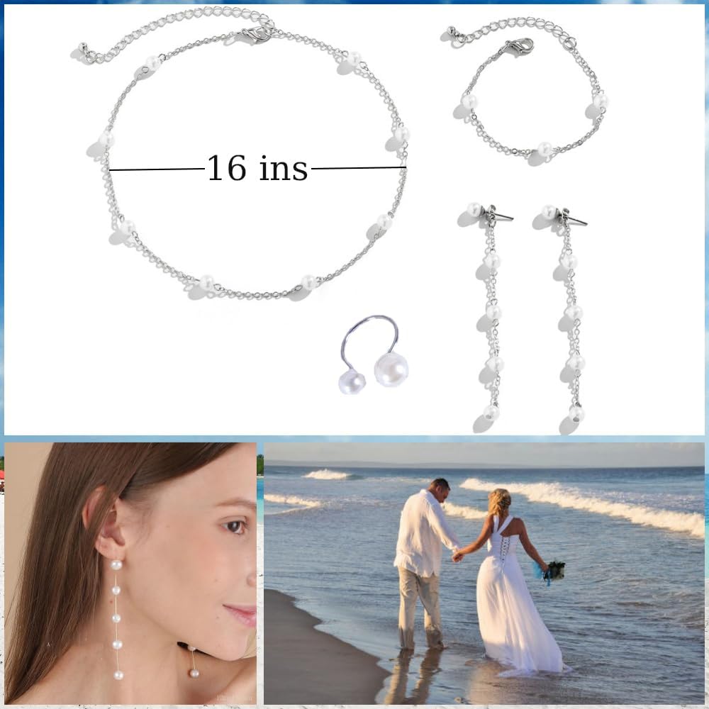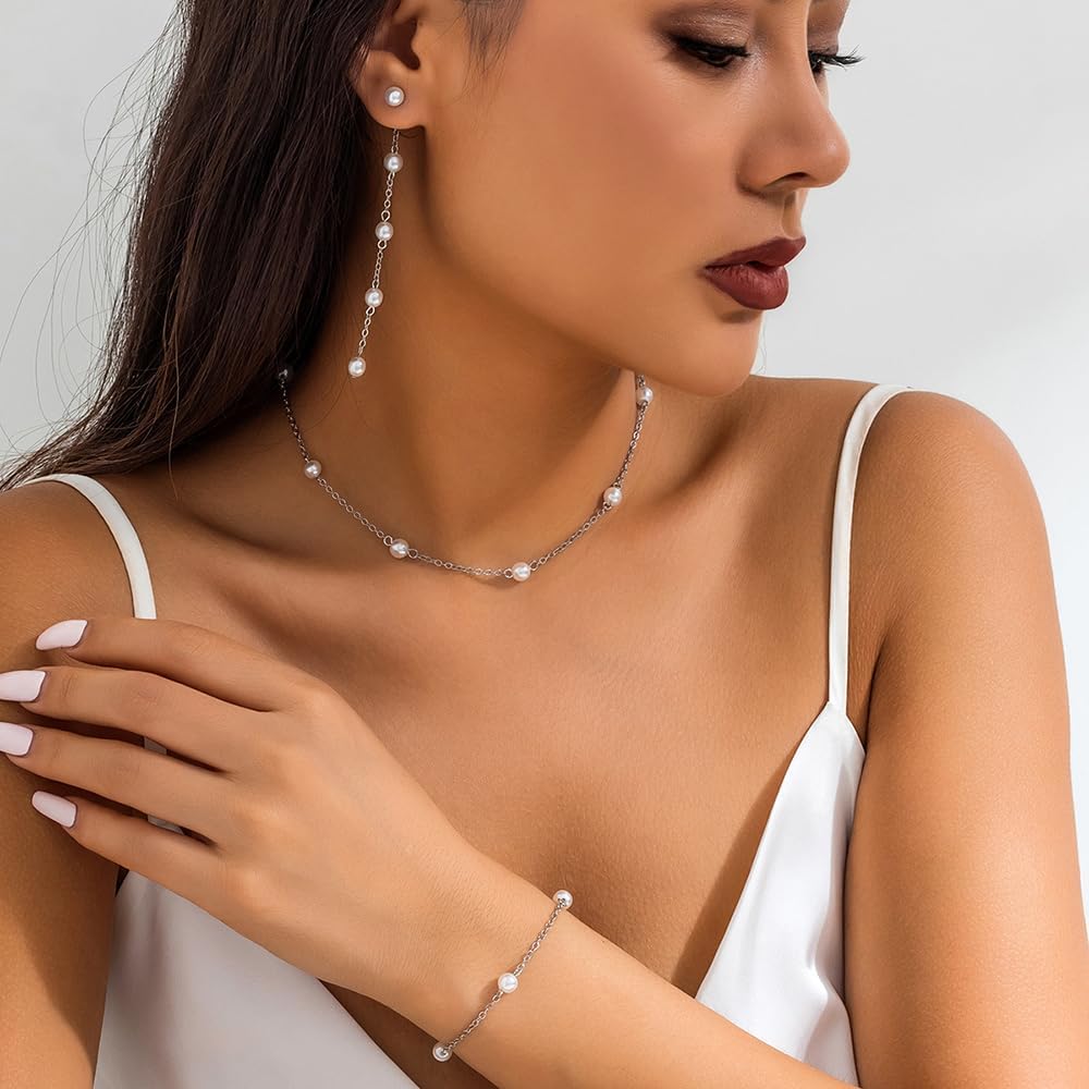Silver Jewelry Set for Women, Long Pearl Earrings Dainty 14K Gold/Silver Plated Pearl Necklace and Earring Set Bridal Pearl Drop Earrings Pearl Choker Necklace Wedding Bridesmaid Jewelry Set Gifts for Women