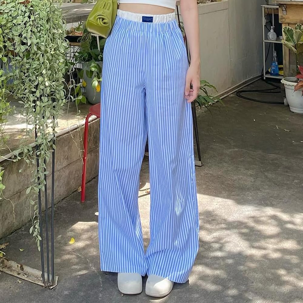 Women's Fashion Stripe Trousers Elastic High Waist Letter Sign Wide Leg Pants with Pockets Streetwear