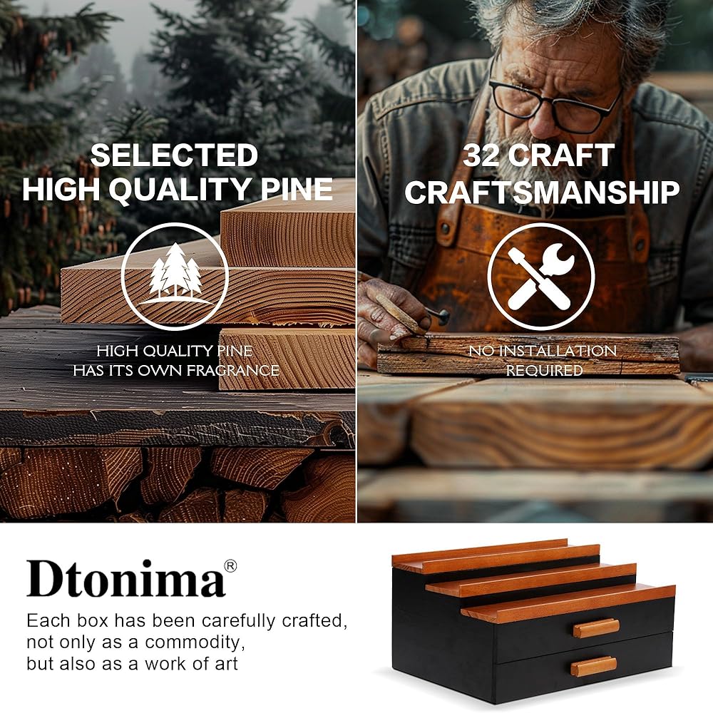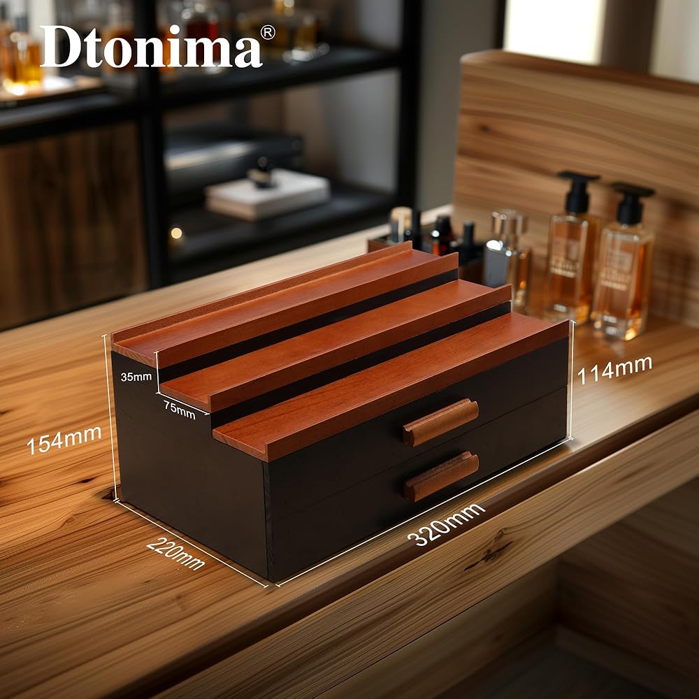 • [100% High-Quality Pine Wood and Exquisite Craftsmanship]: DTONIMA cologne organizer made from 100% high-quality pine wood, moisture-proof and corrosion-proof. The painted finish on the surface is smooth and rich in texture and not easy to fall off. Durable and aesthetically pleasing, It is the perfect decoration for your dressing table.