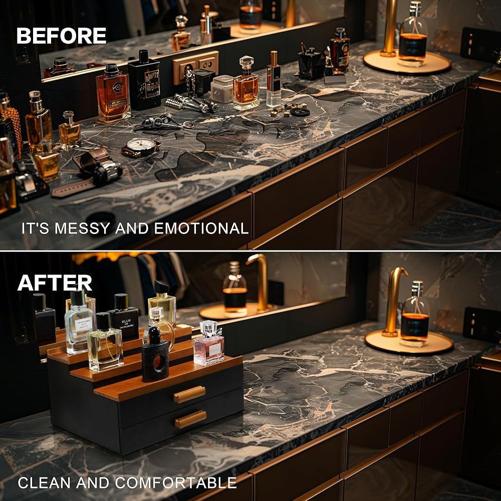 • [Luxurious and High-End Exterior Design]: Our cologne holder features a stylish black and brown color-contrast design, combining simplicity and elegance for a luxurious and high-end appearance. The dual-tone aesthetics add a unique touch, making this wooden cologne tray stand out. Elevate the ambiance of your space with this perfect accessory, offering a sophisticated upgrade to your grooming area.