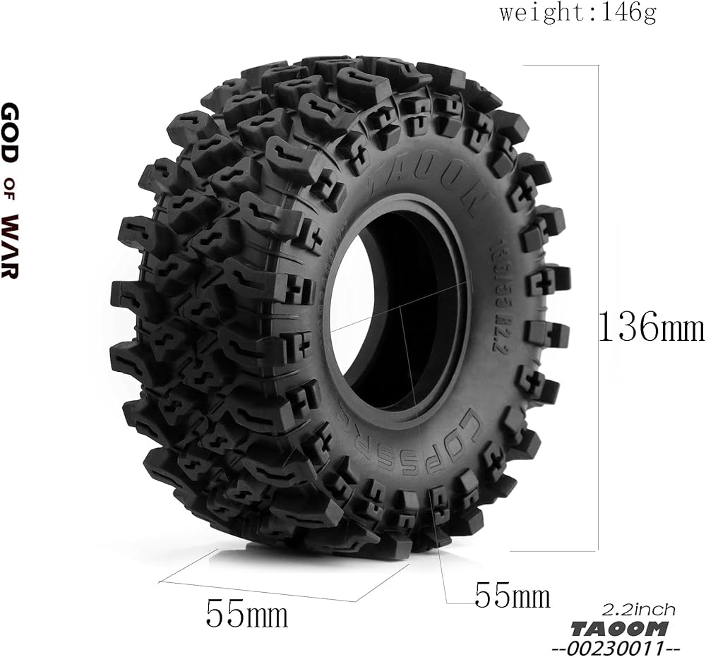 🔥🔥【Suitable for 1/10 Scale RC Crawler Cars】: These 2.2 RC Crawler tires fit for most 1/10 Scale RC Crawler, for example,TRX4, Axial SCX10 90047 SCX10 II 90046 SCX10 III AXI03007, Redcat Gen 8 and mostly 1/10 RC Crawler Car Truck Parts which have 12mm Hex Hubs