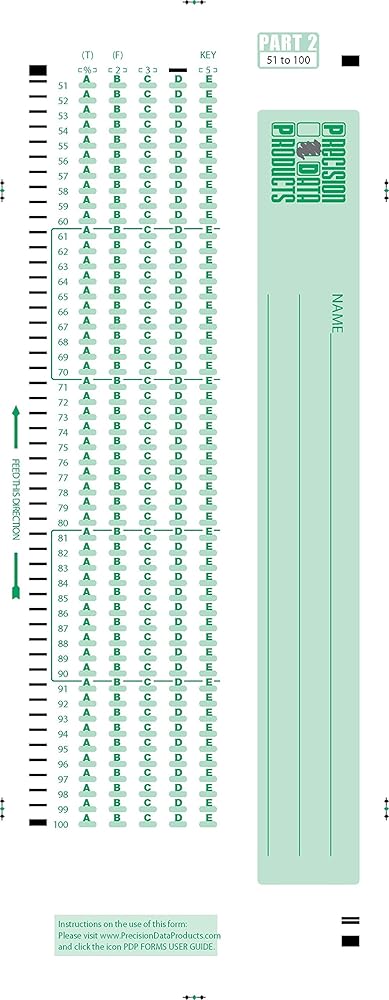 PDP 100 Low-Viz is a 100 Question Testing Form, 100 questions, with1- 50 on front and 51-100 questions on back . Each question has 5 response choices (A-E). Subjective area for additional scoring. Precision Data Products is in no way affiliated with Scantron. Precision Data Products has been supplying Educators and Students forms for Scantron testing machines since 1992.