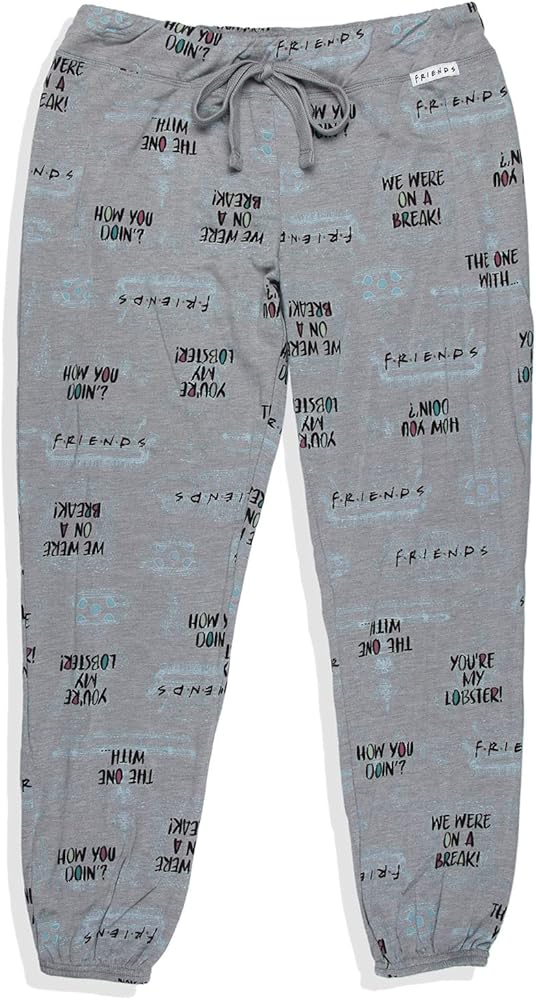 Friends, the show is the all-time popular Television series of 3 young men and three young women -- of the BFF kind -- who live in the same apartment complex and face life and love in New York. There is Rachel, Monica, Phoebe, Joey, Chandler, and Ross. They can often be found enjoying a coffee or two at the cafe Central Perk. These pajama jogger pants feature several of the iconic sayings from the series including "How You Doin', 'You're My Lobster', 'We Were On A Break!' and many more!