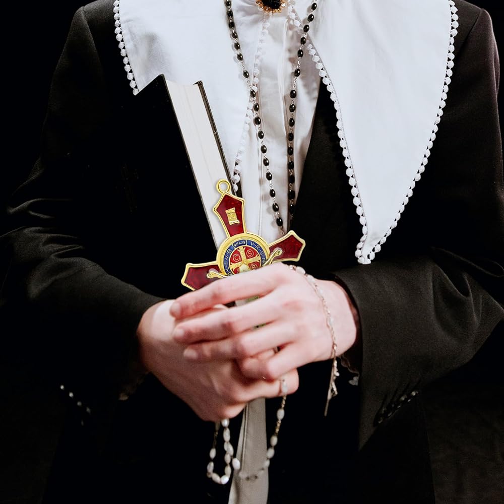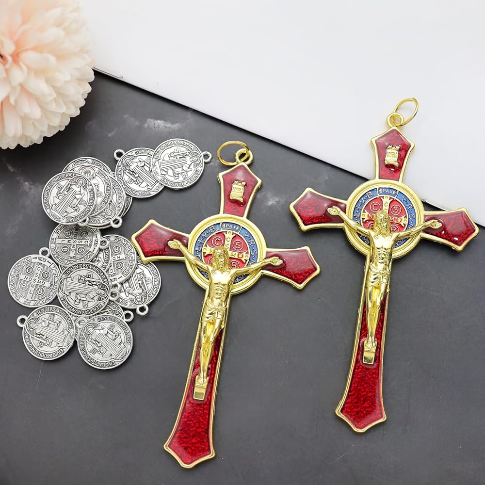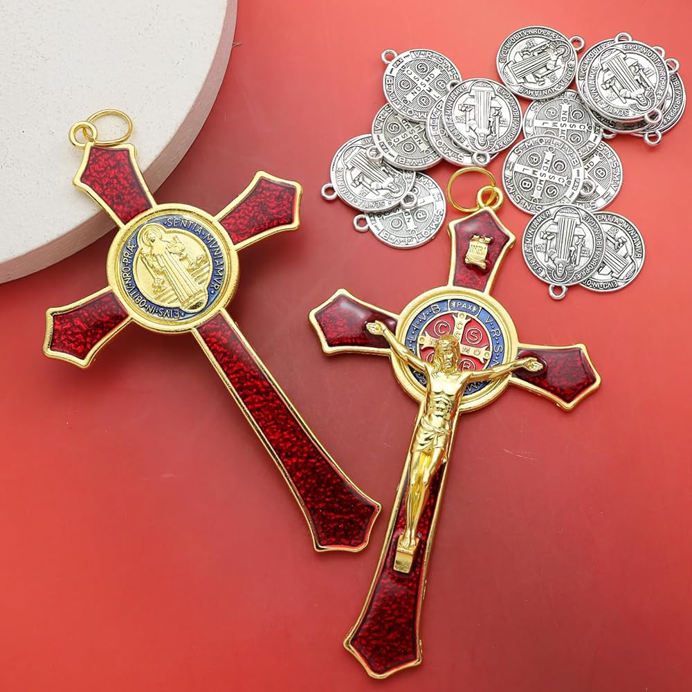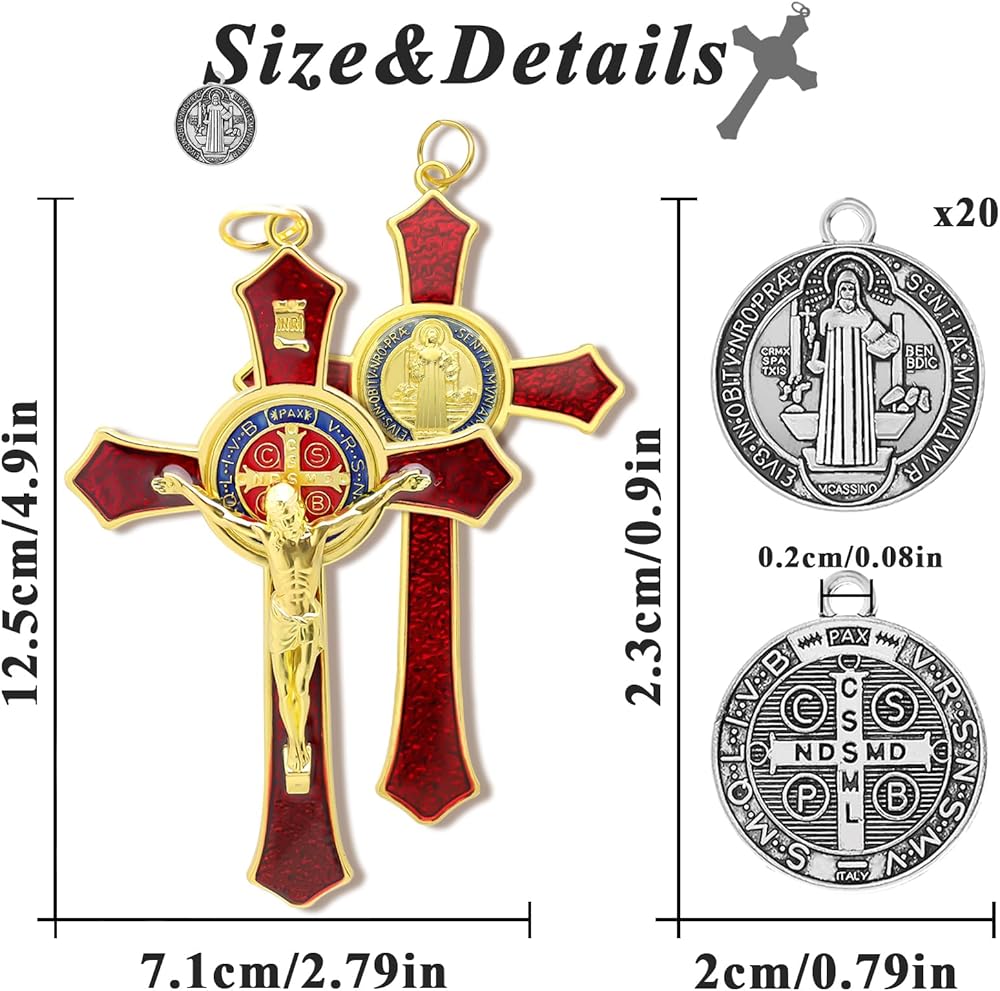 Aswitnove 22 Pcs St Benedict Crucifix Accessory Set, 2 Pcs 4.9 x 2.7 Inch Enamel Crucifix Wall Cross Decor 20 Pcs 0.9 x 0.79 Inch San Benito Medalla Pendant Catholic Protection Prayer Decoration Red