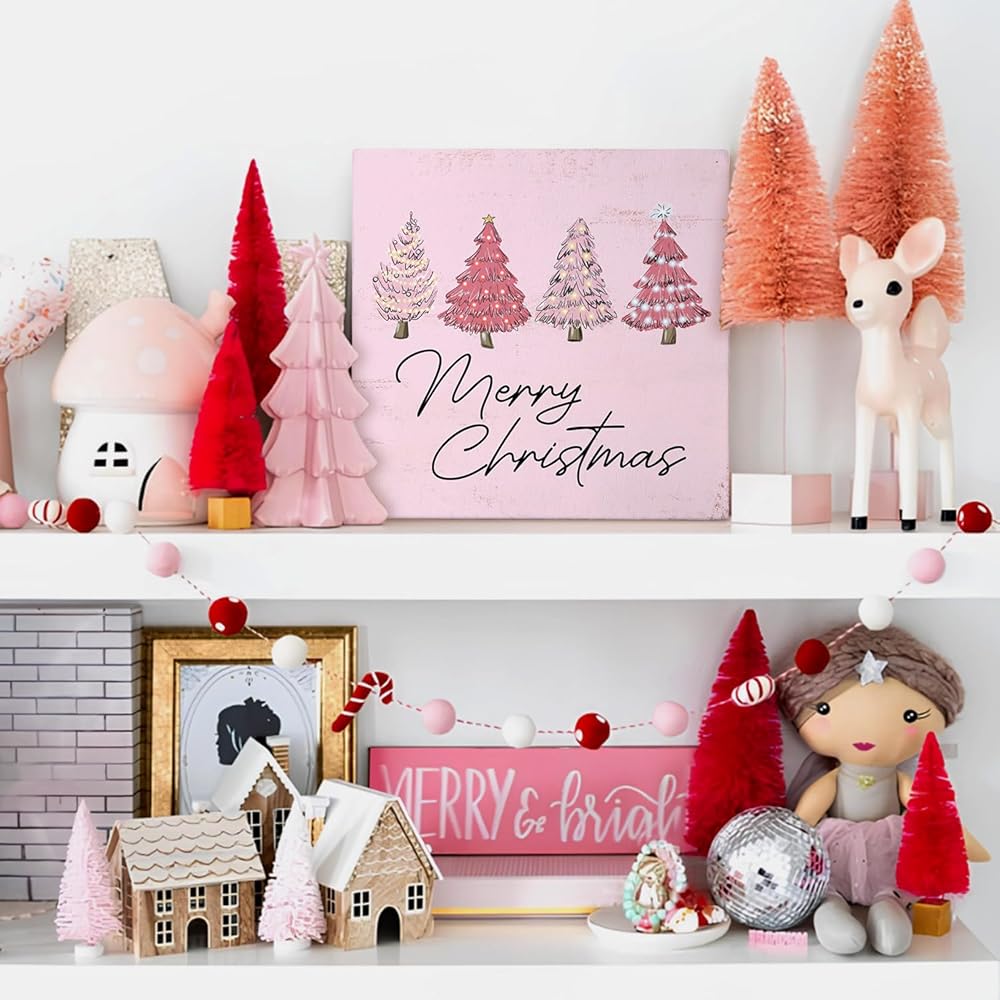Mtrgdn Pink Christmas Tree Decorations Sign,Pink Merry Christmas Sign Decor,Rustic Xmas Tree Wood Box Signs for Home Bedroom Bathroom Office Desk Table Decor,5x5 Inch