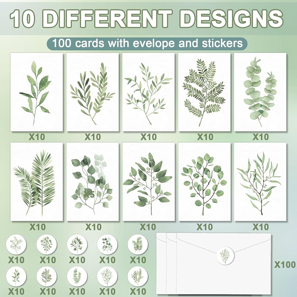 Greenery greeting cards bulk: This package includes 50pcs greenery blank cards in 10 styles, 50pcs white envelopes and 50pcs delicate green leaves stickers, sufficient quality to meet your various needs to express your blessings.
