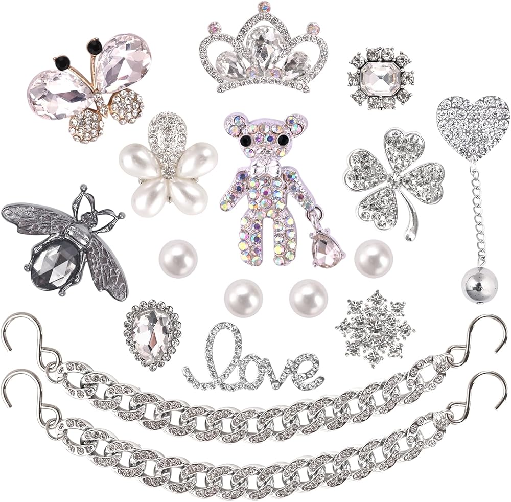 🎁Package Include: 15 pieces Shoe charm pins with different style (bear, Four Leaf Clover, butterfly, love, crown, pearls,flower, just as picture shown) and 2 bling chains