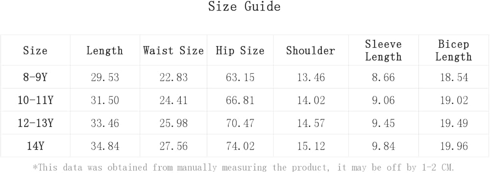 8-9Y:Bicep Length:18.5IN,Hip Size:63.1IN,Length:29.5IN,Shoulder:13.5IN,Sleeve Length:8.7IN,Waist Size:22.8IN
