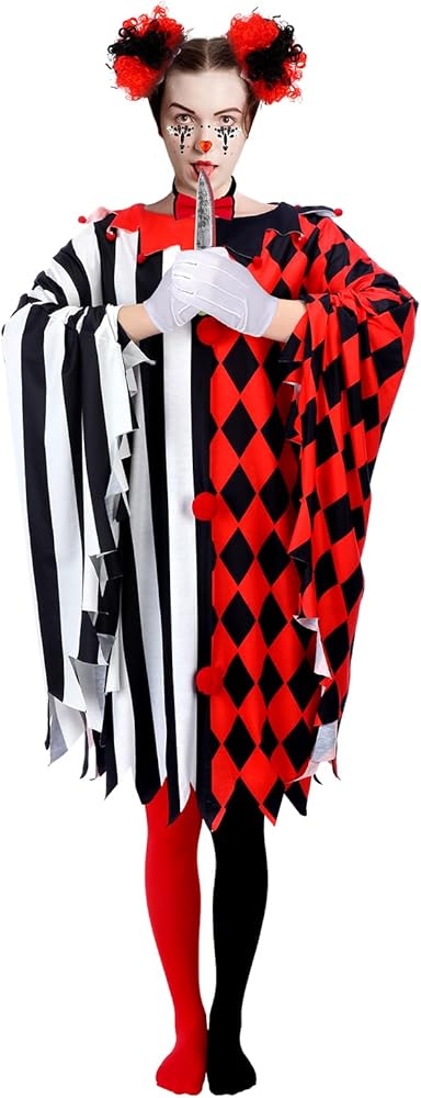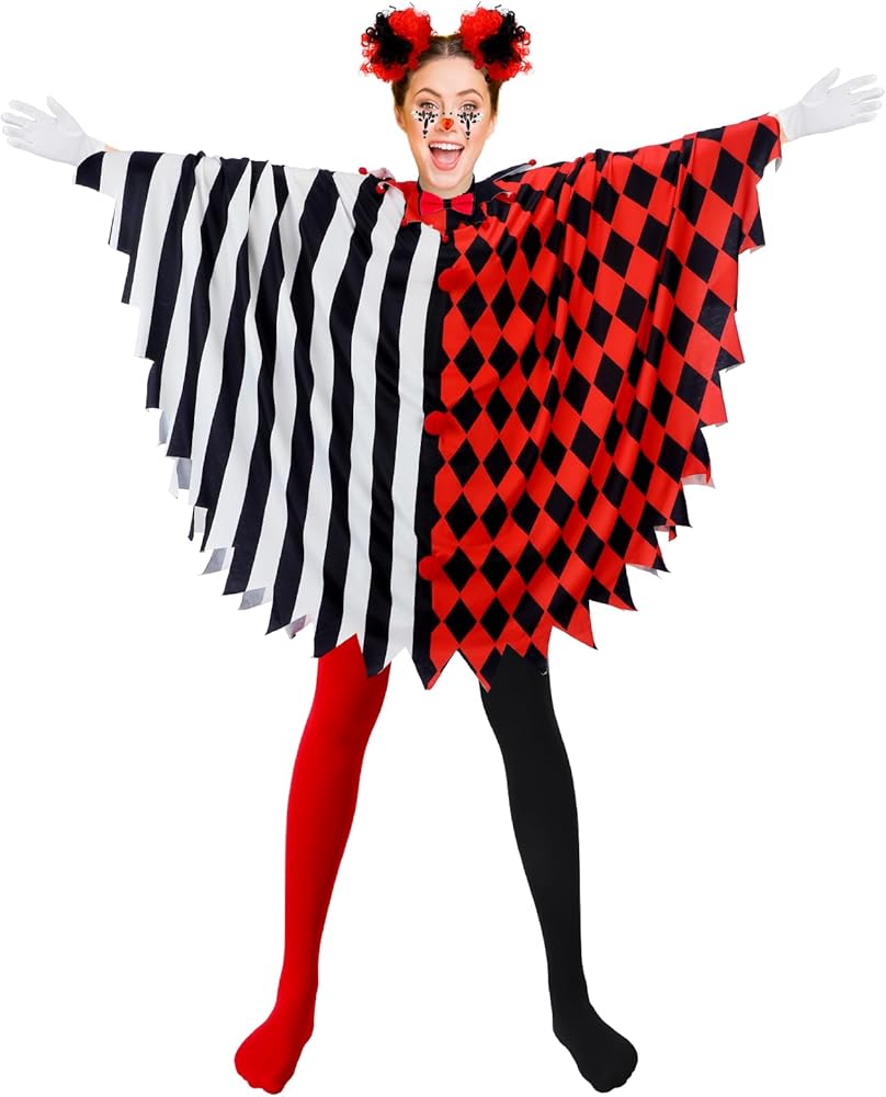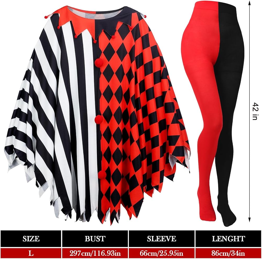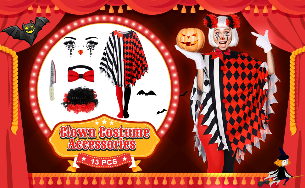 Suhine 13 Pcs Halloween Scary Poncho Clown Costume Accessories for Women Plus Size Black Red Clown Poncho Costume Set Wig Tights Face Rhinestone Stickers Tie for Bloody Creepy Halloween Party Cosplay