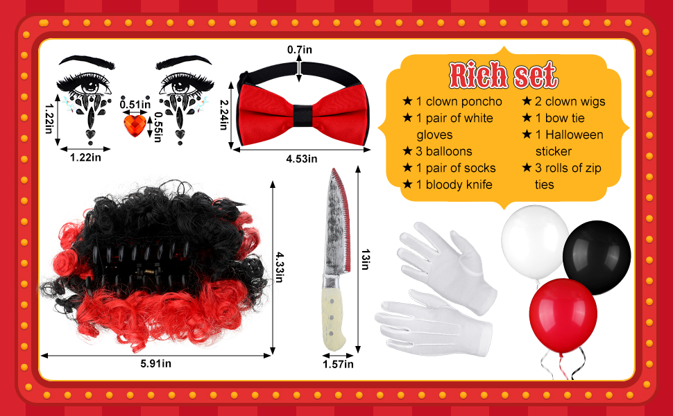 What Will Get: the package comes with 1 clown poncho in black and red check, 1 pair of white gloves, 3 pieces of 10 inches balloons in matte white, black and red, 1 pair of socks in red and black, 1 bloody pointed knife, 2 clown wigs in red and black, 1 bow tie in red and black, 1 sheet of Halloween stickers, 3 rolls of wire tie, 5 meters per roll