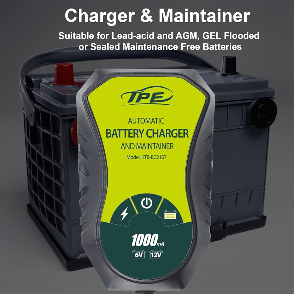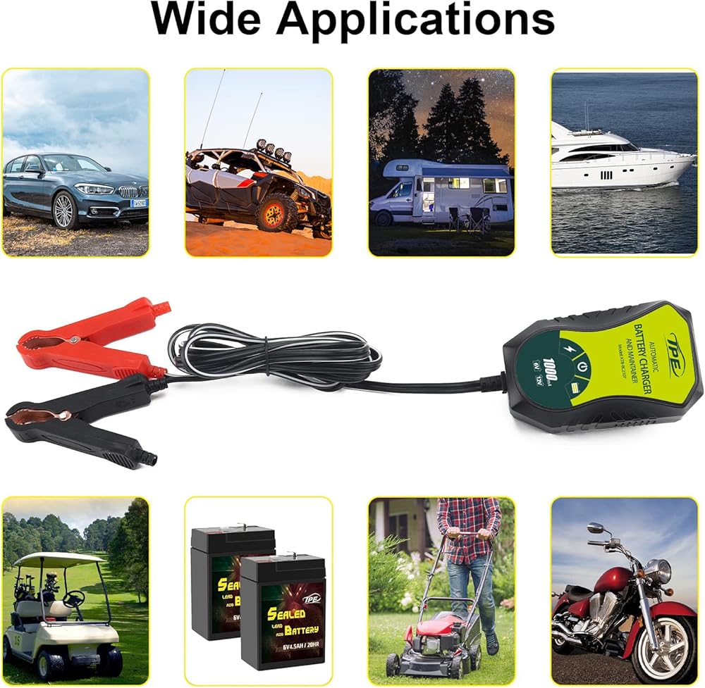 1A Fully-Automatic Smart Charger, 6V and 12V Portable Automotive Car Battery Charger Car Motorcycle ATV SUV Lawn Mower Lead Acid Battery Charger Maintenance Battery with Reverse Connection Protection