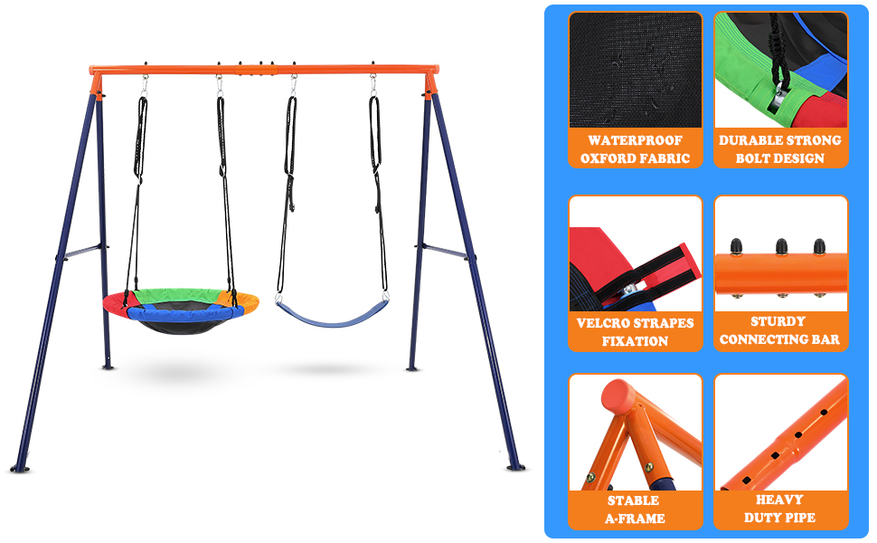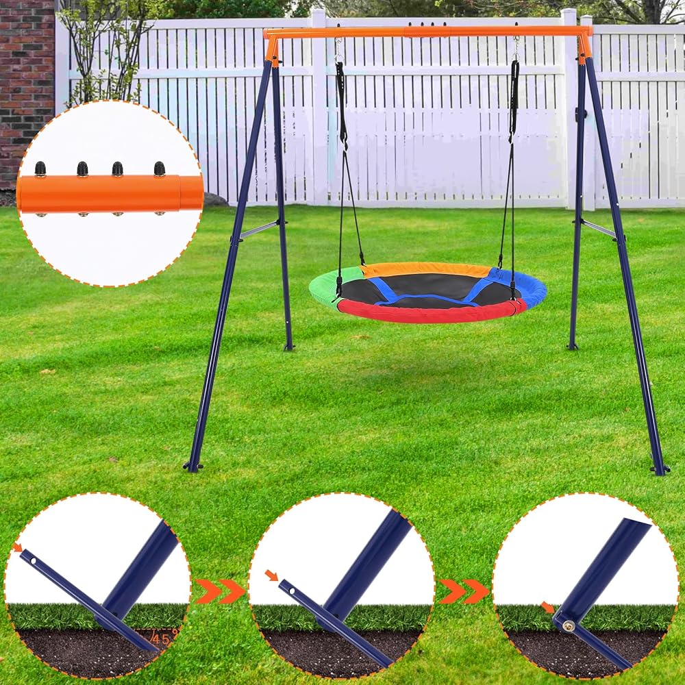 【LOAD CAPACITY 440LBS】The swing set features an A-frame design with 4 ground pegs for you to secure the swing frame to the grass; the seat is made of durable polymer plastic with a non-slip and waterproof surface. Excellent stability brings you happiness while ensuring your safety.