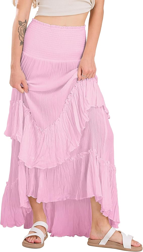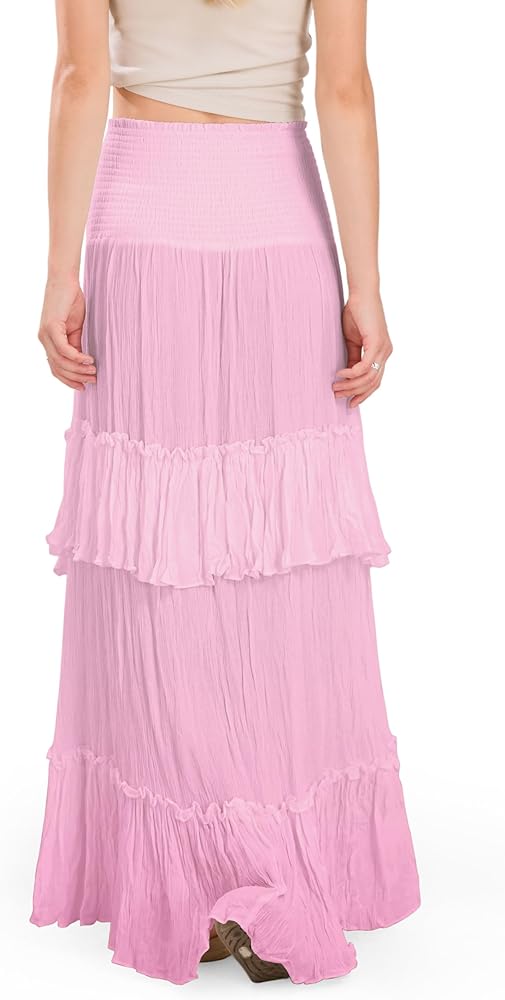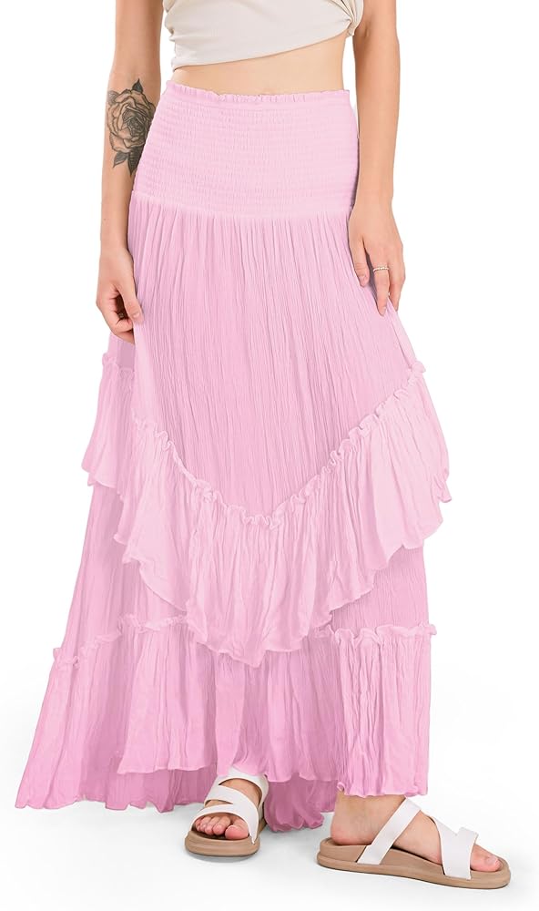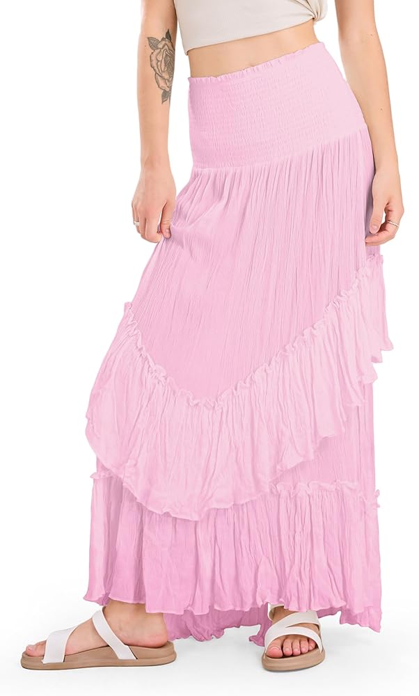【Highlights】Summer Gauze Flowy a Line Maxi Long Dress, Lightweight Airy Fabric For Summer Wear; Wide Smocked Elastic Waist Asymmetric Tiered Long Skirt, Shirred Waist For Added Comfort; Convertible Maxi Long Skirt, Wear It As Summer Long Skirt, Or Wear It As Strapless Sundress