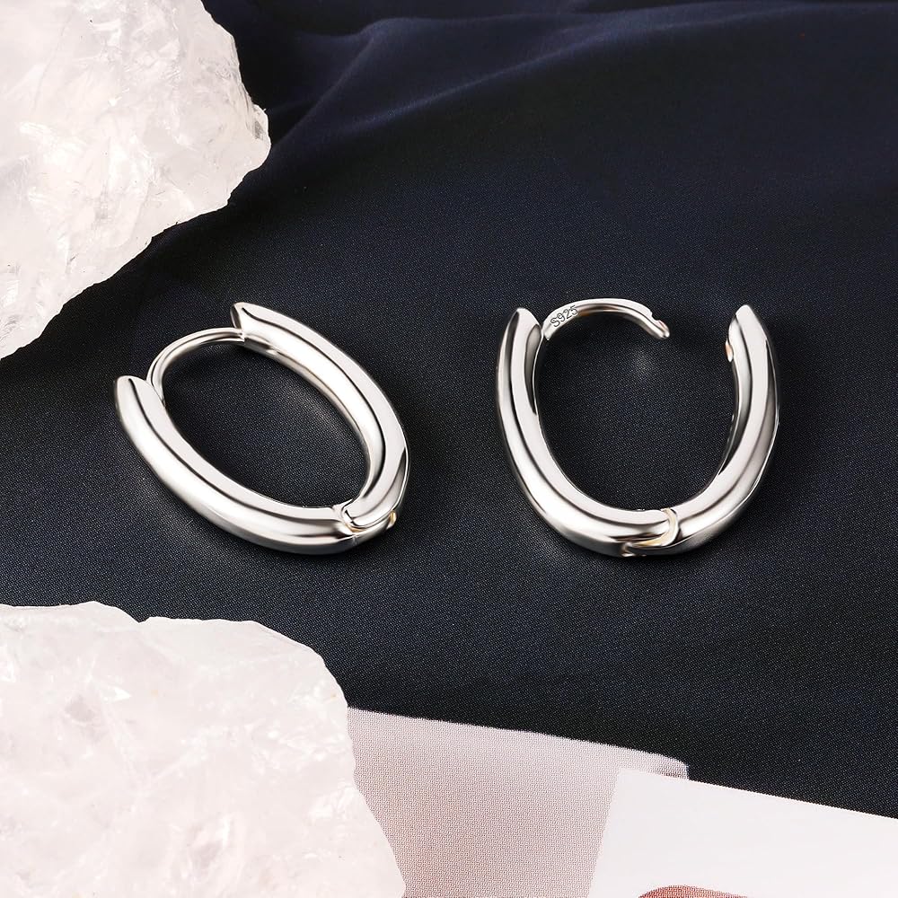 These silver small chunky oval hoop earrings are 15mm by 20mm and 3mm thick,11.4g/0.4oz per pair in weight, thick huggie design, which is minimalist and stylish.Lightweight and comfortable to wear, easy to put on and take off, and won't pull your earlobes down. It's the perfect addition to your earring collection!