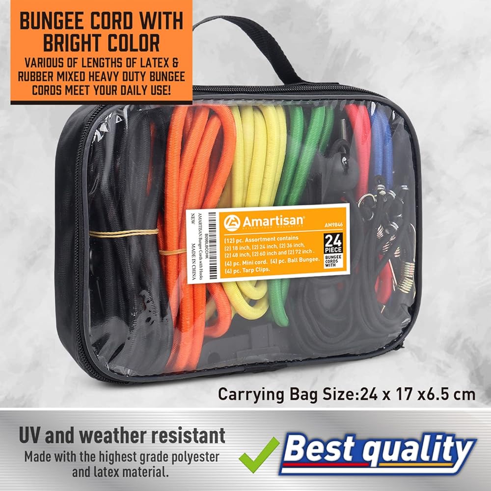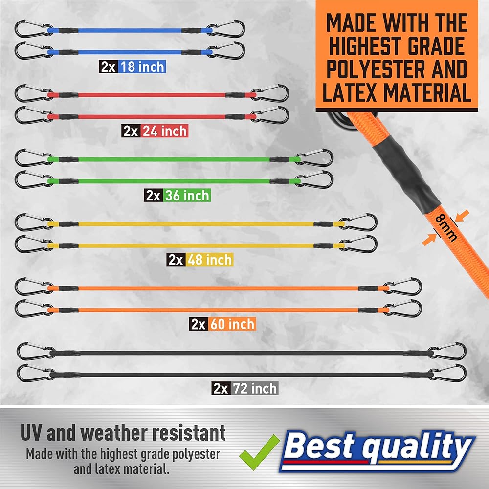[Multiple Sizes]: Carabiner bungee cord set includes - 2PC 72", 2PC 60", 2PC 48", 2PC 36", 2PC 24", 2PC 18" Bungee Cord with Carabiner Hook, 4PC Mini cord , 4PC Ball Bungee, 4PC Tarp Clips.