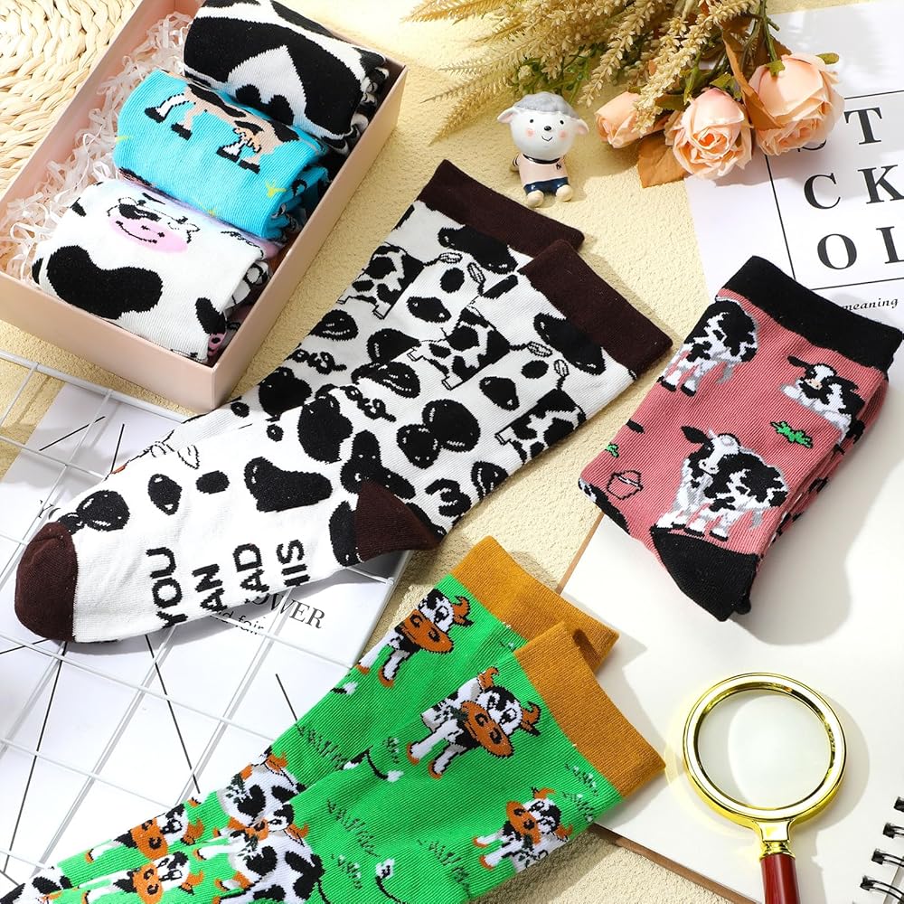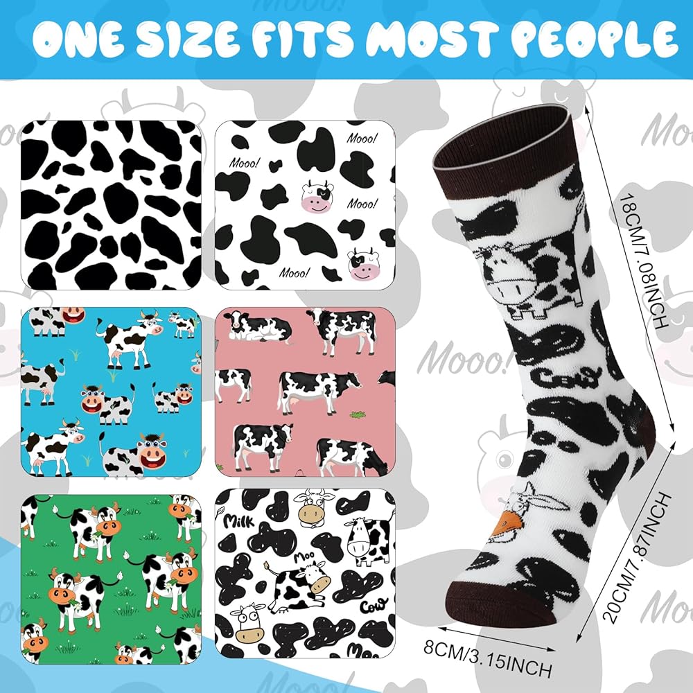 Creative Cow Print Stuff: 6 pairs of cow socks, showcasing different cow patterns; The fun and interesting designs also carry humorous phrases, sure to delight girls, women and boys who love animals or just wish to add a quirky touch to their outfits