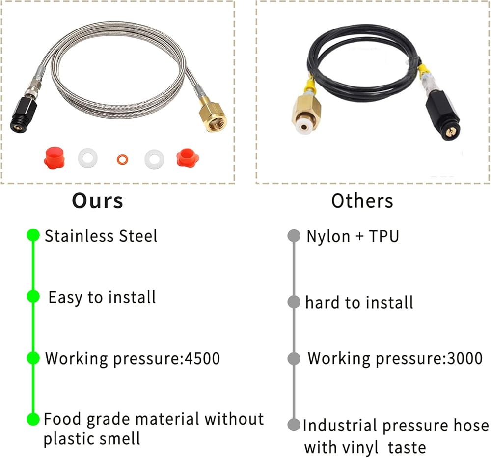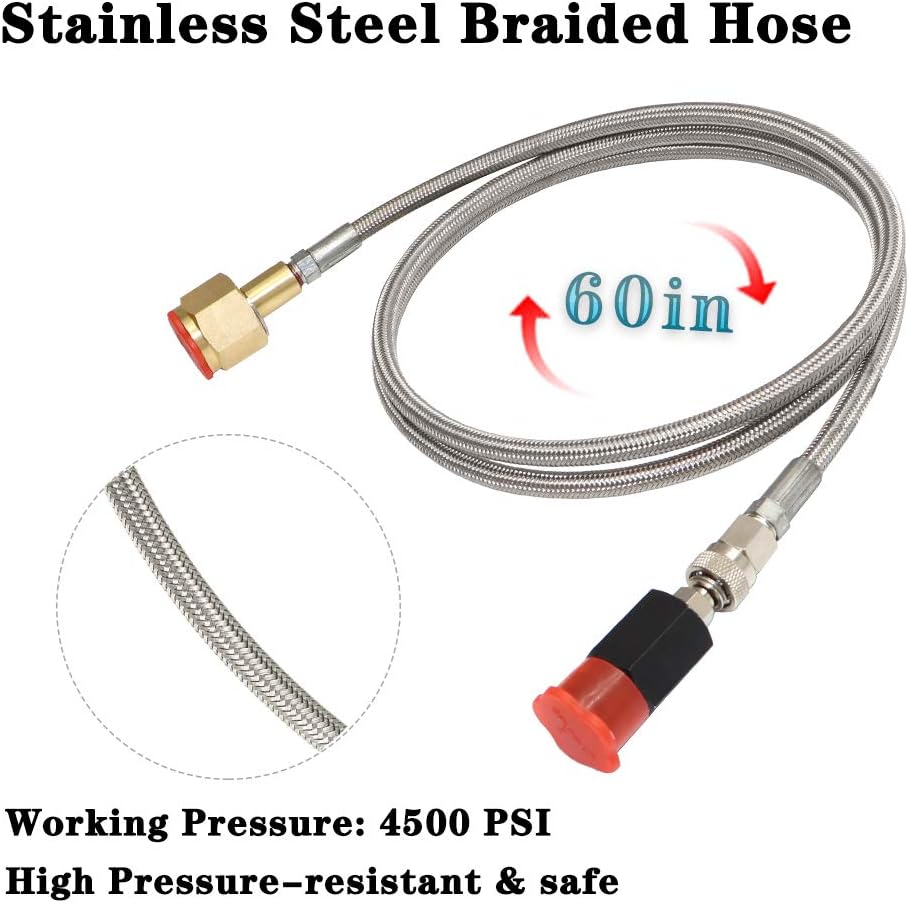 Durable Material: The 60in cga320 to tr21-4 soda machine hose is made of stainless steel & solid brass, High-pressure resistance, high-temperature resistance, anti-rust, anti-corrosion, anti-aging, not easy to deform. Thicker and durable, maximum working pressure: 4,500 psiDurable Material: The 60in cga320 to tr21-4 soda machine hose is made of stainless steel & solid brass, High-pressure resistance, high-temperature resistance, anti-rust, anti-corrosion, anti-aging, not easy to deform. Thicker and durable, maximum working pressure: 4,500 psi