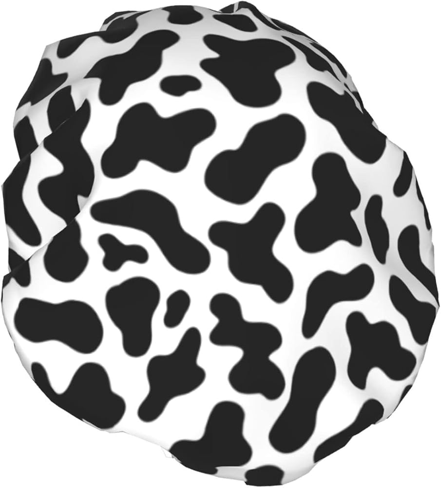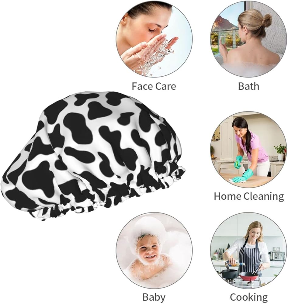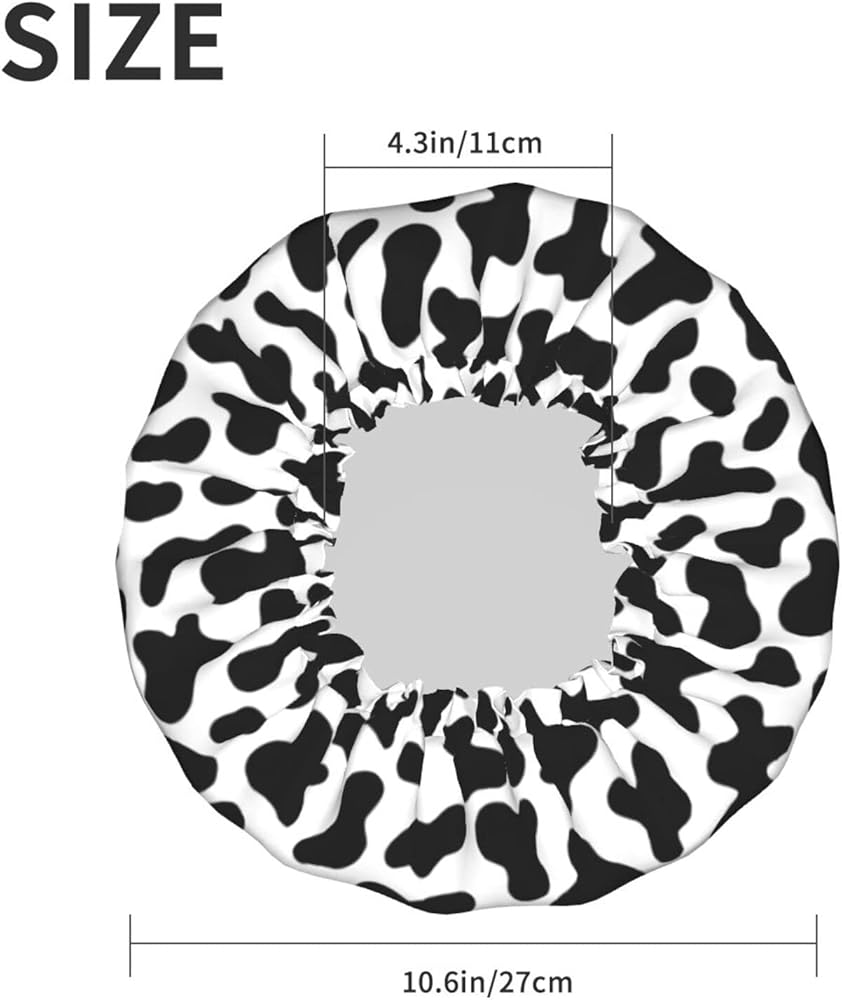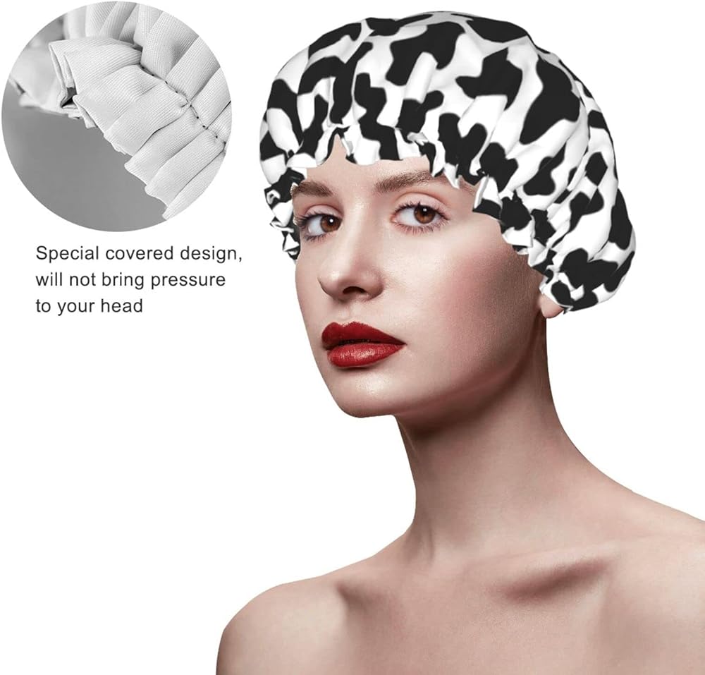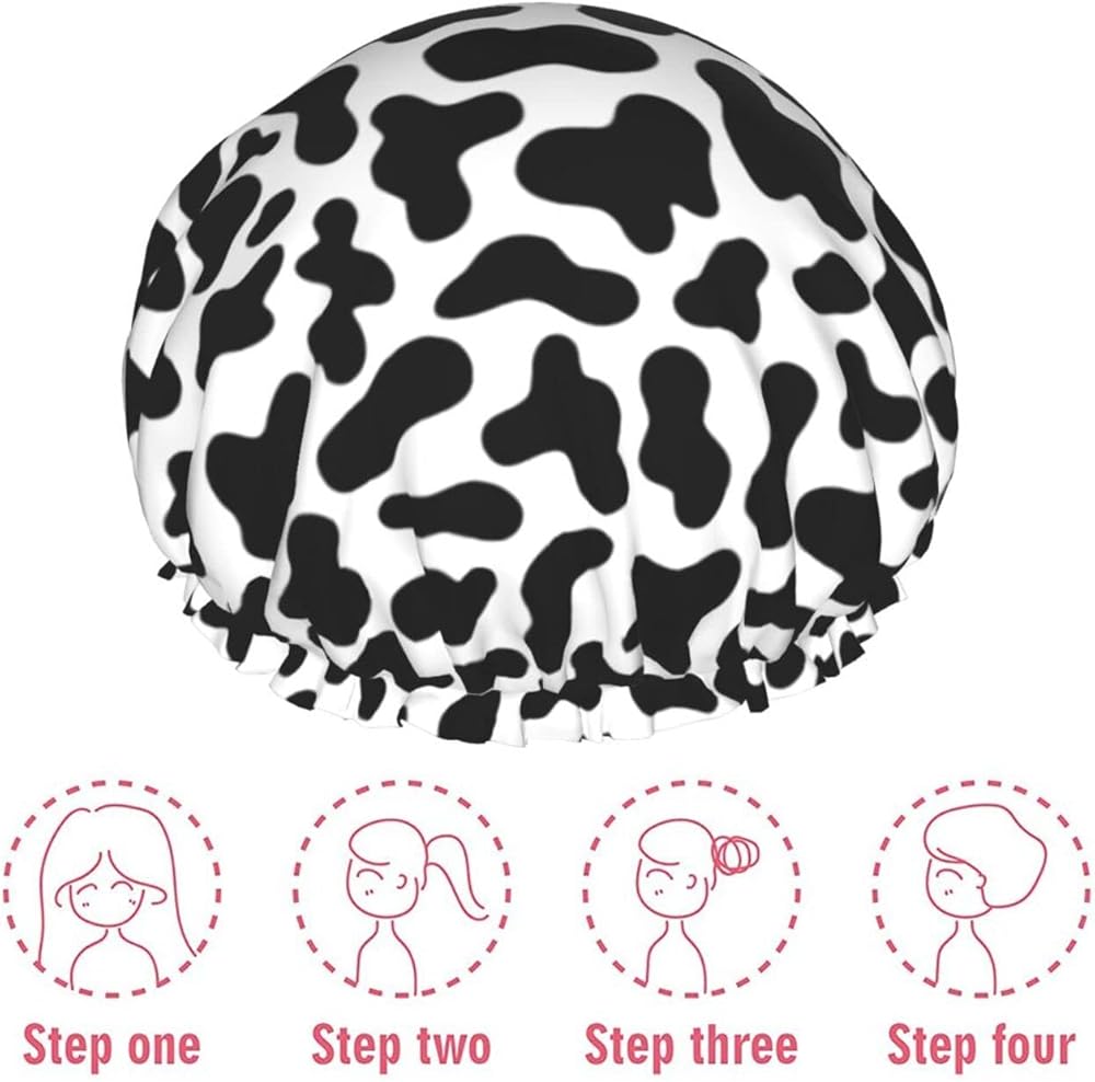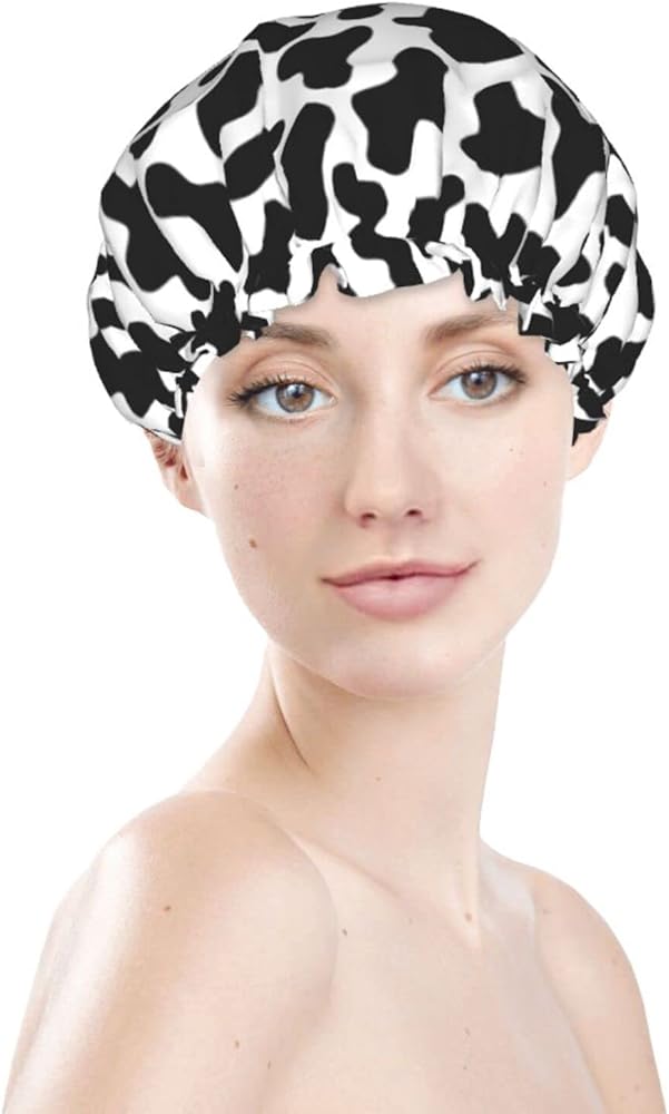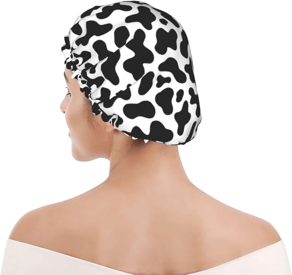 Black And White Cow Skin Abstract Animal Farm Shower Cap For Women Adjustable Double Waterproof Layers Bathing Bath Cap Hair Protection Reusable Ladies Spa Salon Shower Hat