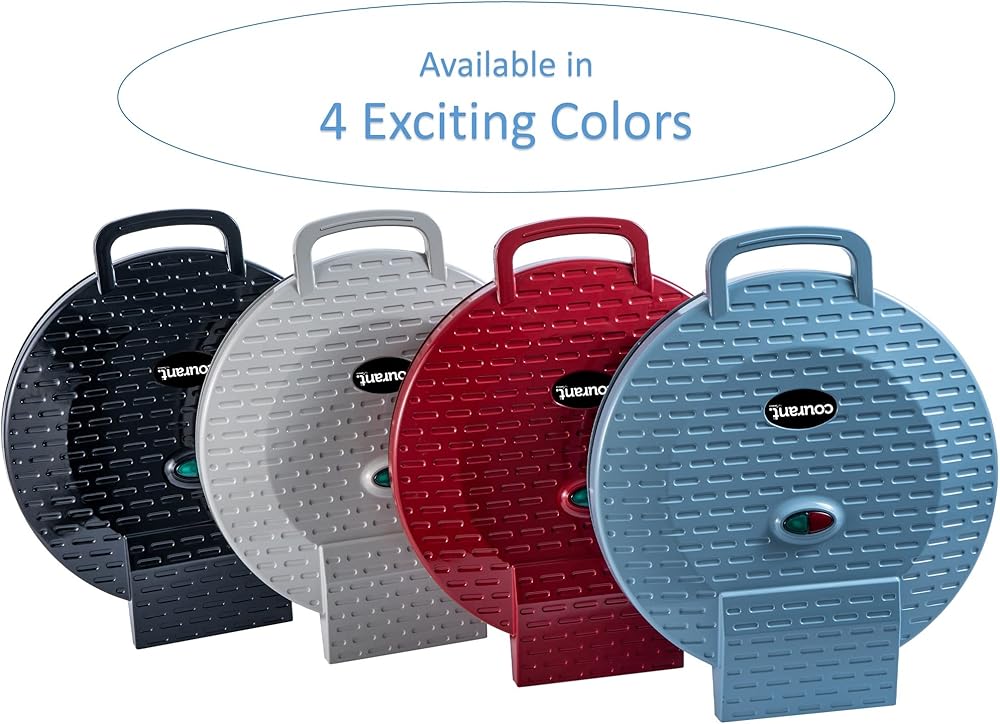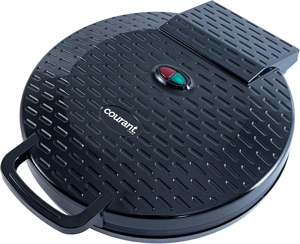 Have yourself a hot and crispy 12 inch Pizza in under 15 minutes with the CPM-1220 by Courant. Brilliantly designed with nonstick plates and Compact size for easy storage. It's always a good time for Pizza! FRESH OR REHEAT with that crispy crust. Bake Chicken Cutlets, Meat, or any sort of Snacks, Quesadillas, Nachos, Mini Frittatas, Quiche, Croissants, Giant Cookies, or JUST ABOUT ANYTHING! Heats up FAST with its Top & Bottom Hating Plates + Non-stick coated cooking plates for easy clean up. Power-on and Ready-to-Cook indicator lights keep you in the know when the Oven is ready to cook. The Oven is compact to fit about anywhere in the kitchen when is use, and stands upright for easy and compact storage SAFETY FIRST: with the Newly improved Cool-touch Handle, Unit Dimensions: 13x15.63x 3.95 (LxWxH) Power cord length 28”. Unit Weight 5.5 lbs ETL Certified, Power: 1440 Watts, 120V, 60Hz.