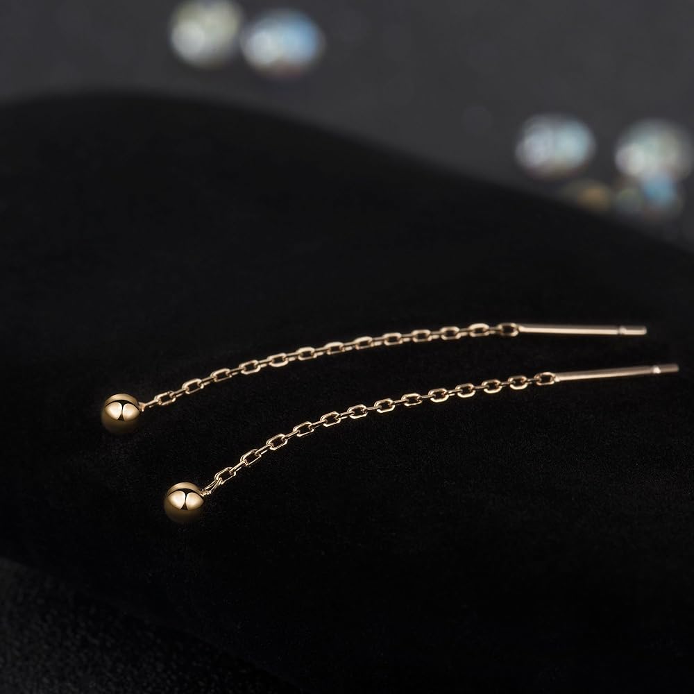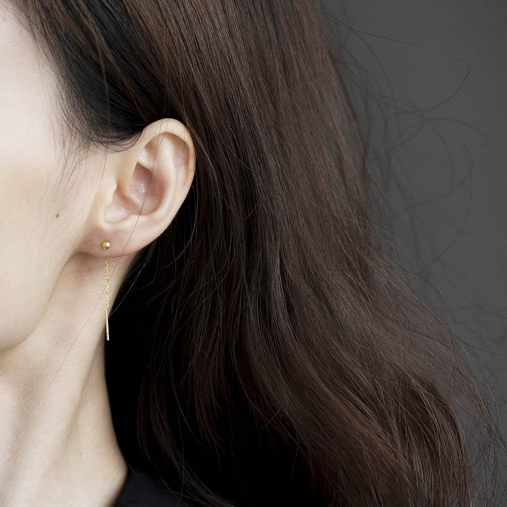 Minimalism thread earrings, this pull through earrings is easy to put on, simply slide them through your ear. The dangle earrings for women is consist in a round tiny ball charm, and a thin delicate sterling silver chain dangling from the front to the back of your ear
