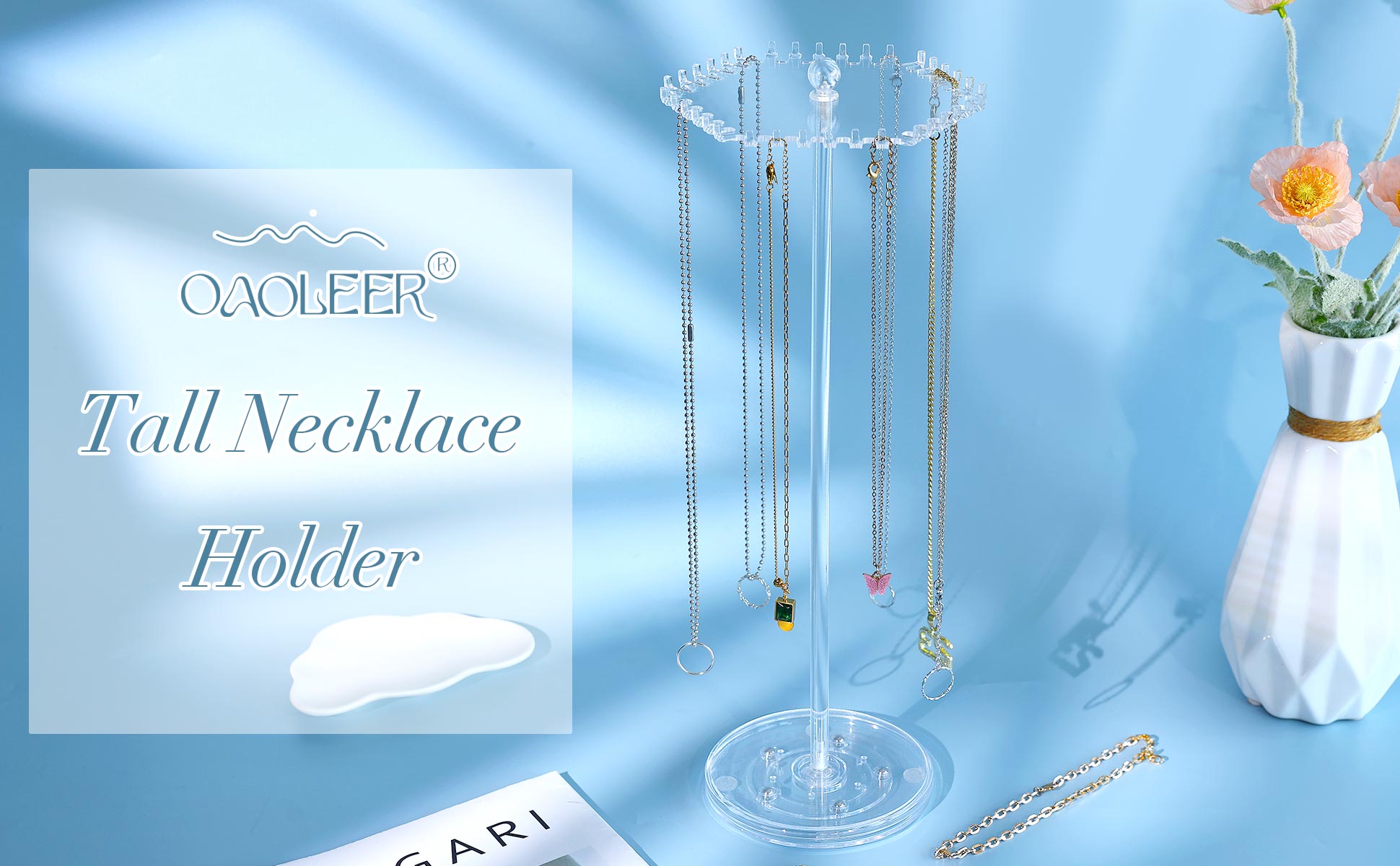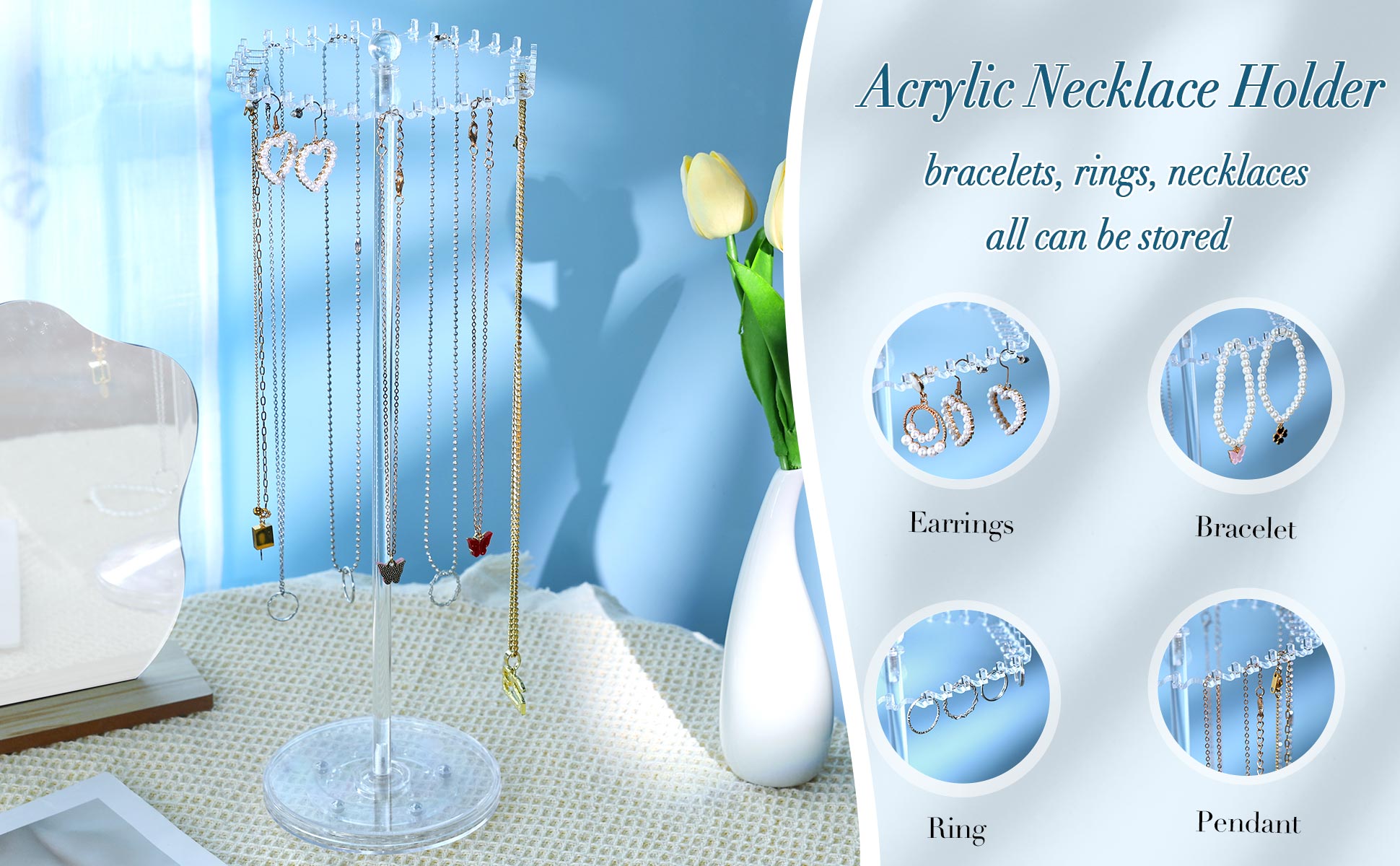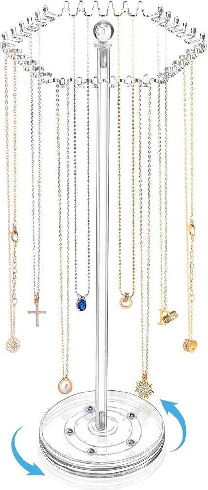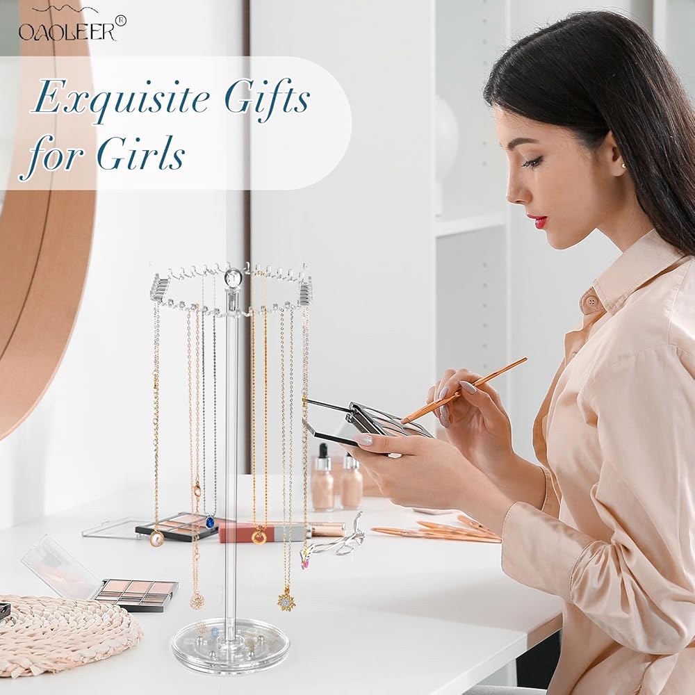Small and 360°Rotating: The body of the necklace holder for girls is long and thin, and the top is not big but has 36 separate small hooks, so you can put acrylic jewelry stand at any corner to save space rotating to the desired position. You don't have to worry about the necklace getting tangled up again