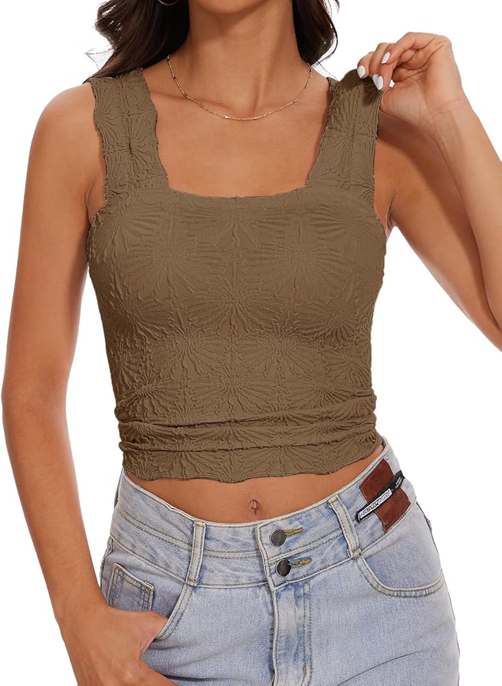[SOFT SUSTAINABLE MATERIAL/SOFT FABRIC] - Trendy skinny Jacquard Flower Textured Wide Strap Square Neck Crop Tank Cami, made of soft three-dimensional flower embroidery fabric, stretchy, lightweigh, durable, no see through, wrinkle-resistant, non-pilling, breathable and comfy to wear all day in summer, spring, fall; Naked technology fabric, not tight, fits every inch of skin on the body, showing or even better interpreting the beauty of the body