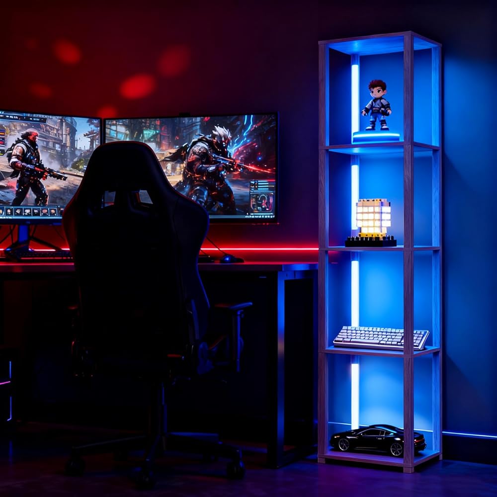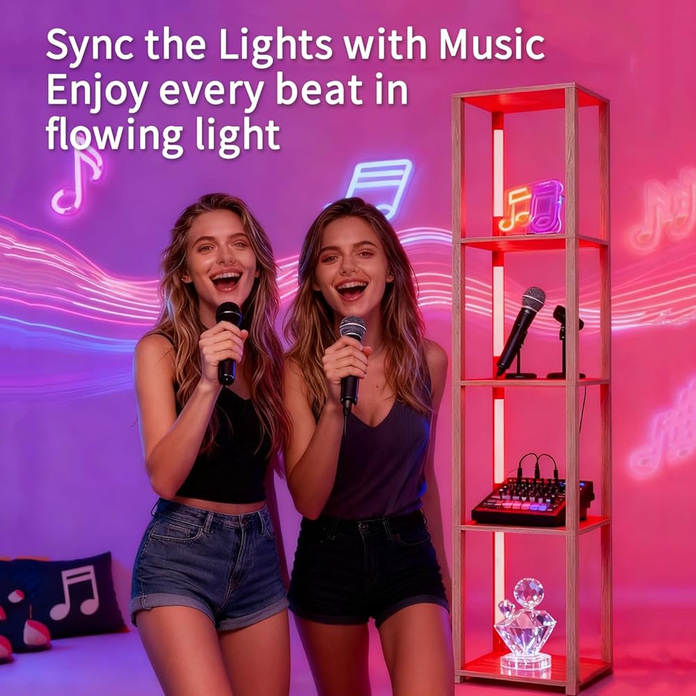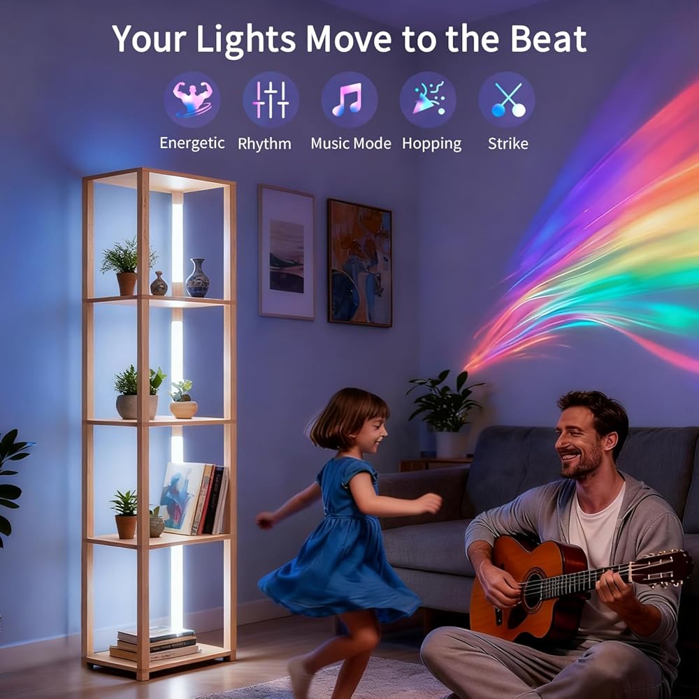 【Storage & Display】Enhance your home decor with this stunning display shelf lamp with Remote/App Control (Scan the QR code on the power cord to download the app). Its sleek design features a built-in shelf, perfect for showcasing your collectibles and display cases. This versatile shelf floor lamp can be placed in your bedroom, living room, hallway, or office, providing storage or display space for your various collectibles, trophies, statues, antiques, souvenirs, perfumes, vases, Legos, books, comics, photo albums, or other items.
